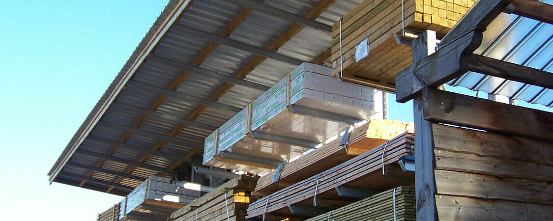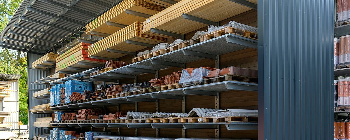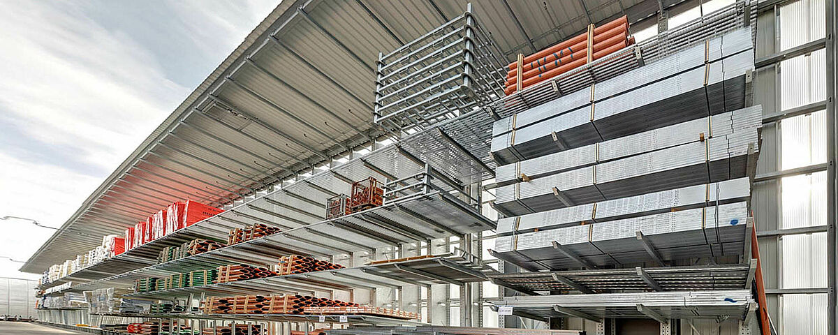 In this type of halls, the vertical supports of the cantilever racks are cut at an angle at the top, depending on the shape of the roof, and fitted with panels or purlin brackets. The roof structure for the cantilever rack hall will then be built on top of this. For the wall cladding, trapezoidal sheets or ISO noise protection panels or weather protection systems can be attached to the rear of the rack.