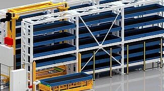 2. TowerMat TM-FE is designed for medium storage capacities and, thanks to multiple storage towers and a central stacker crane, enables particularly high efficiency.