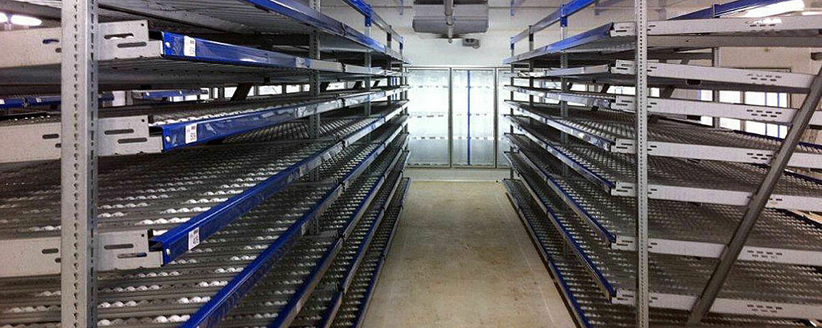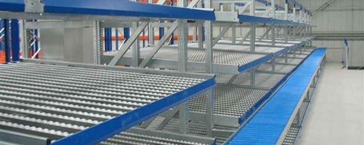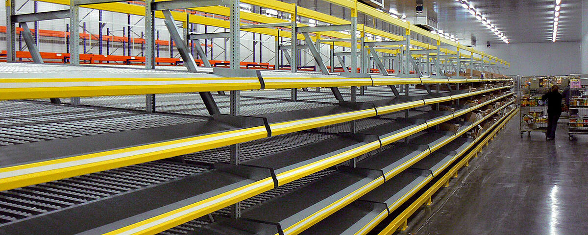 Pallet flow racks are space-saving solutions that can be installed according to the ‘first-in-first-out’ principle and enable high space utilisation through passageway formation. Order picking flow racks are particularly suitable for carton goods or crates with roller conveyors and optimise work travel distances and picking times according to the FIFO principle. Push-back racking, also known as trolley systems, are space-saving innovative storage systems according to the ‘last-in-first-out’ principle and enable the storage of up to 6 pallets deep on trolleys.