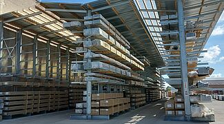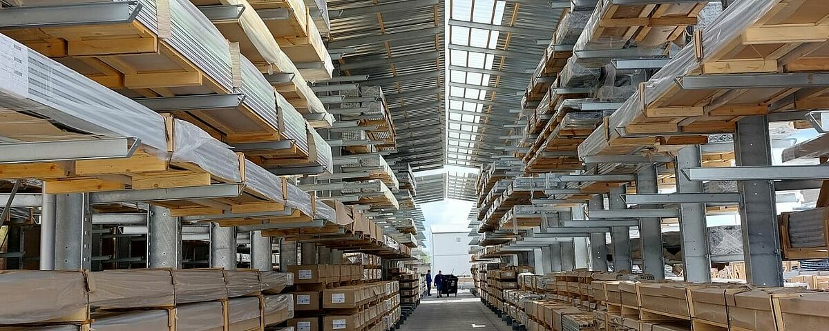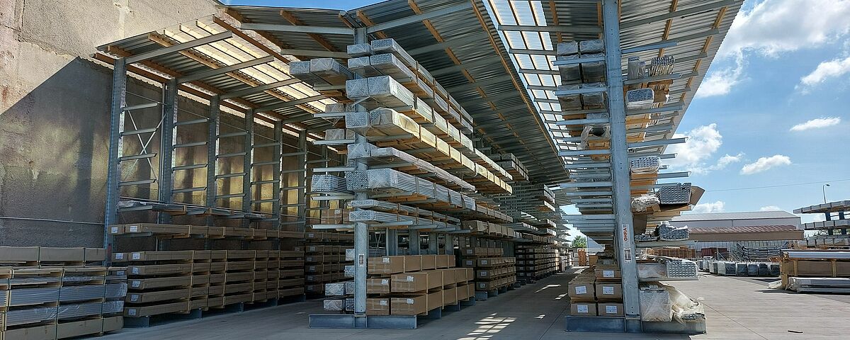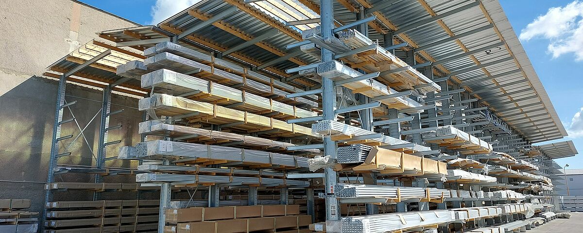 ALBIXON finally found a racking solution tailored to the requirements at the manufacturer OHRA: Three rows of 7,300-millimetre-high cantilever racks make the best possible use of the available space. The load capacity per cantilever arm is 500 kilograms. The cantilever columns also carry overlapping roofs, some of which are covered with transparent PVC - this ensures good brightness even in the floor area.