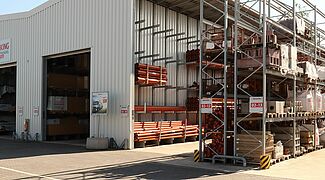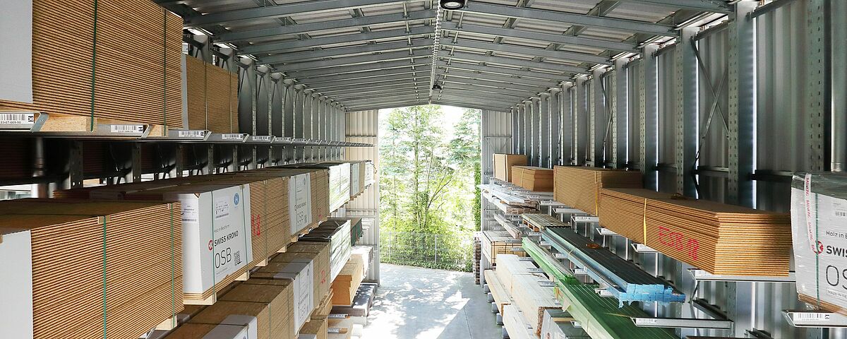 As part of a merger of two locations, BAUKING reorganised the storage of its timber products at its Lorup site. In a new OHRA rack clad building built from cantilever racks, the customers of the building materials retailer can now find all timber goods centrally in one place. The racking system also offers significantly more storage capacity, so that BAUKING can also stock a larger number of different items. To drain the outdoor storage area safely, the floor slab on which the building stands has a slope of 0.7 per cent in two directions. OHRA compensated for the slope by fixing the cantilever arms in a narrow grid of holes and a special, flexible roof construction.