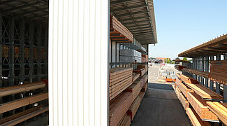 To provide its customers with a better overview and faster access to the timber goods, BAUKING decided to store all timber goods centrally at the site in the new rack clad building. A building of this type, in which the racking acts as a load-bearing structure for the roof and walls, is significantly more flexible and less expensive than a classic warehouse building. BAUKING planned a building constructed from three rows of cantilever racks, each around 20 metres long. The cantilever racks, which are over 7.8 metres high, are equipped with up to seven storage levels.