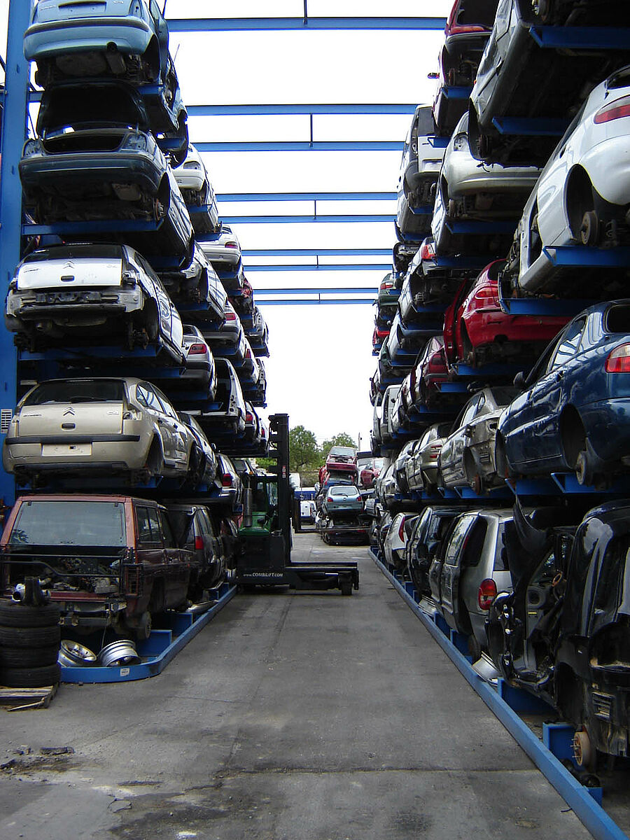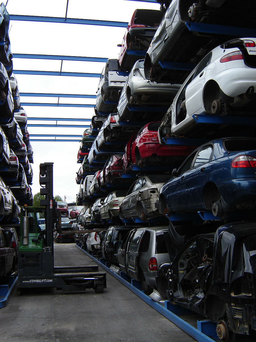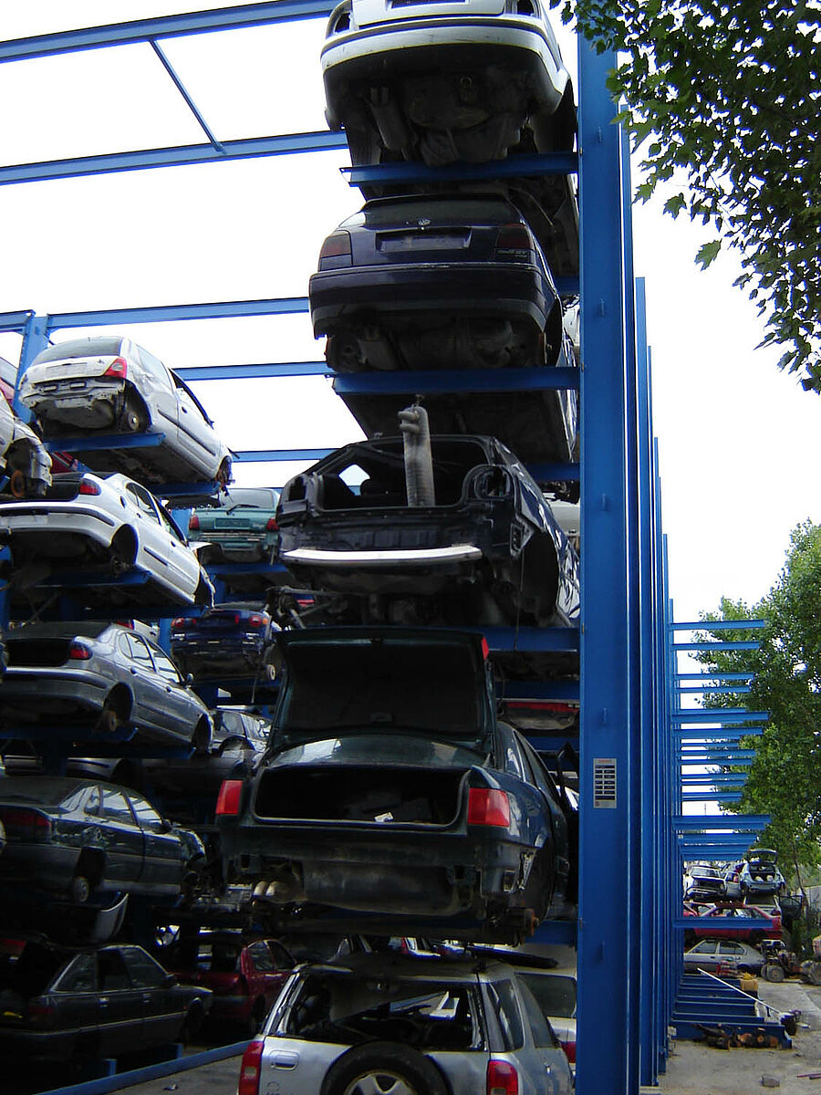 Thanks to the installed rack systems the vehicles can be optimally stored and labelled. Access to all the vehicles is possible at any time by using the simple registration method. Furthermore, recurring processes as part of the cost-intensive work of re-sorting in order to gain access to other stored vehicles is reduced. This also makes itself felt in the fixed costs, which contribute significantly to the efficiency and competitiveness of the recycling plant.