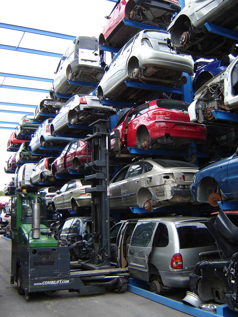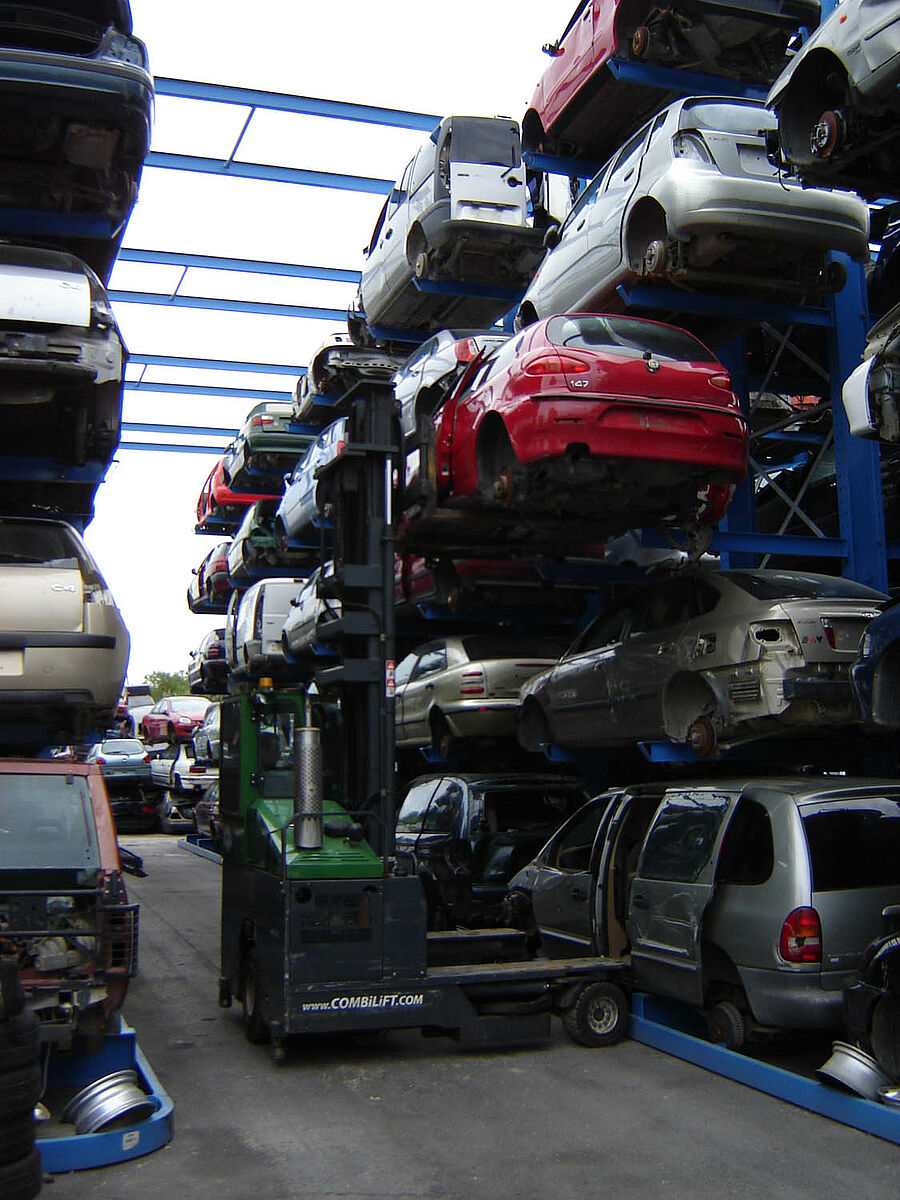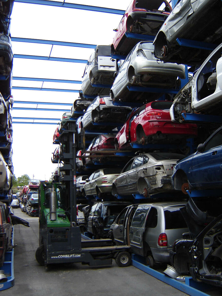 Thanks to the installed rack systems the vehicles can be optimally stored and labelled. Access to all the vehicles is possible at any time by using the simple registration method. Furthermore, recurring processes as part of the cost-intensive work of re-sorting in order to gain access to other stored vehicles is reduced. This also makes itself felt in the fixed costs, which contribute significantly to the efficiency and competitiveness of the recycling plant.