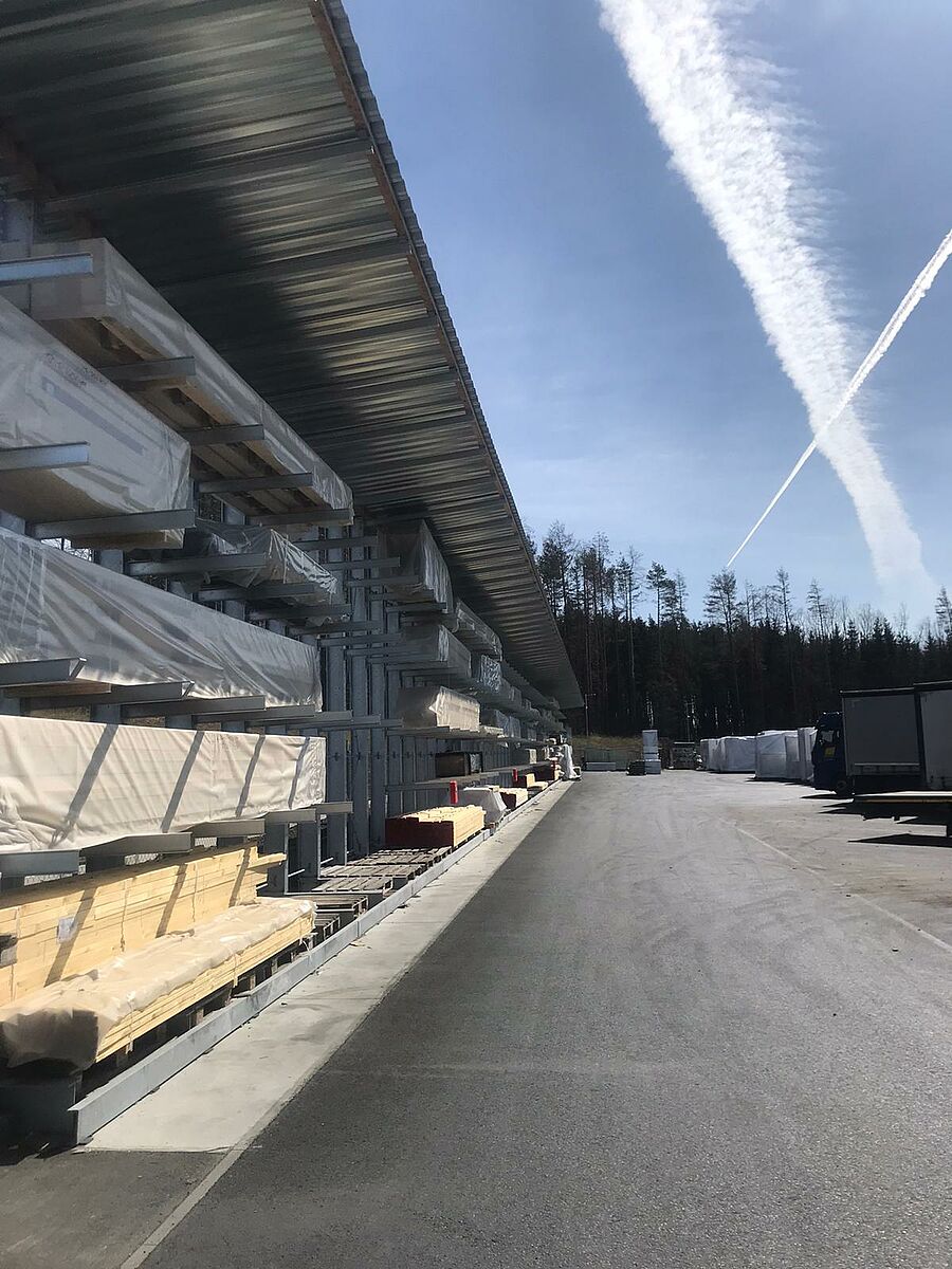 In particular, DFH Haus CZ manufactures prefabricated houses of the Okal brand – these are not small off-the-shelf projects, but individually planned and designed sustainable houses. Consequently, the storage requirements are extensive for the materials required to construct the prefabricated house components. To provide enough storage capacities for this, the company first installed cantilever racks externally in 2018, which defied wind and weather thanks to hot-dip galvanising and the sloping roof. The racks are approx. 6 metres high and offer up to five storage levels, with each of the 1.200 mm long arms carrying a weight of up to 1 tonne.