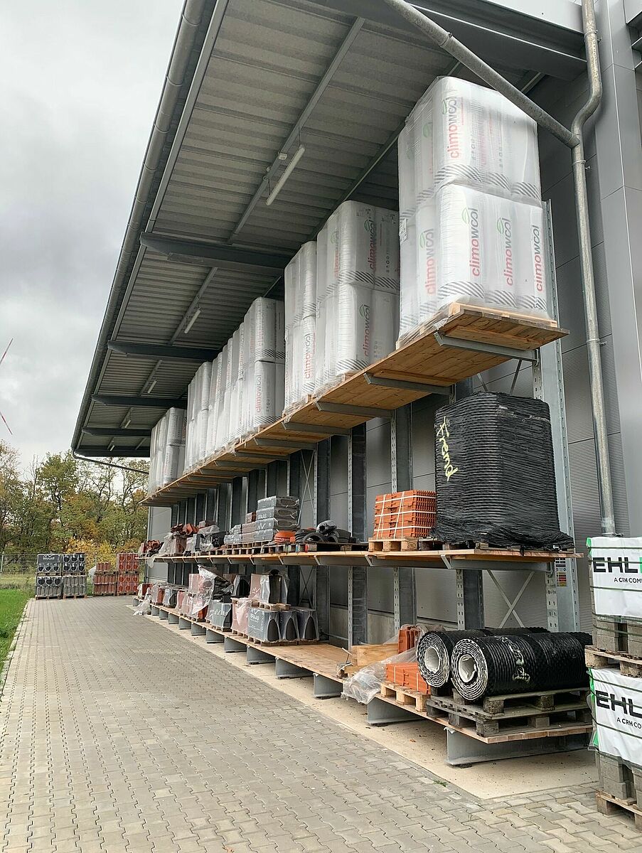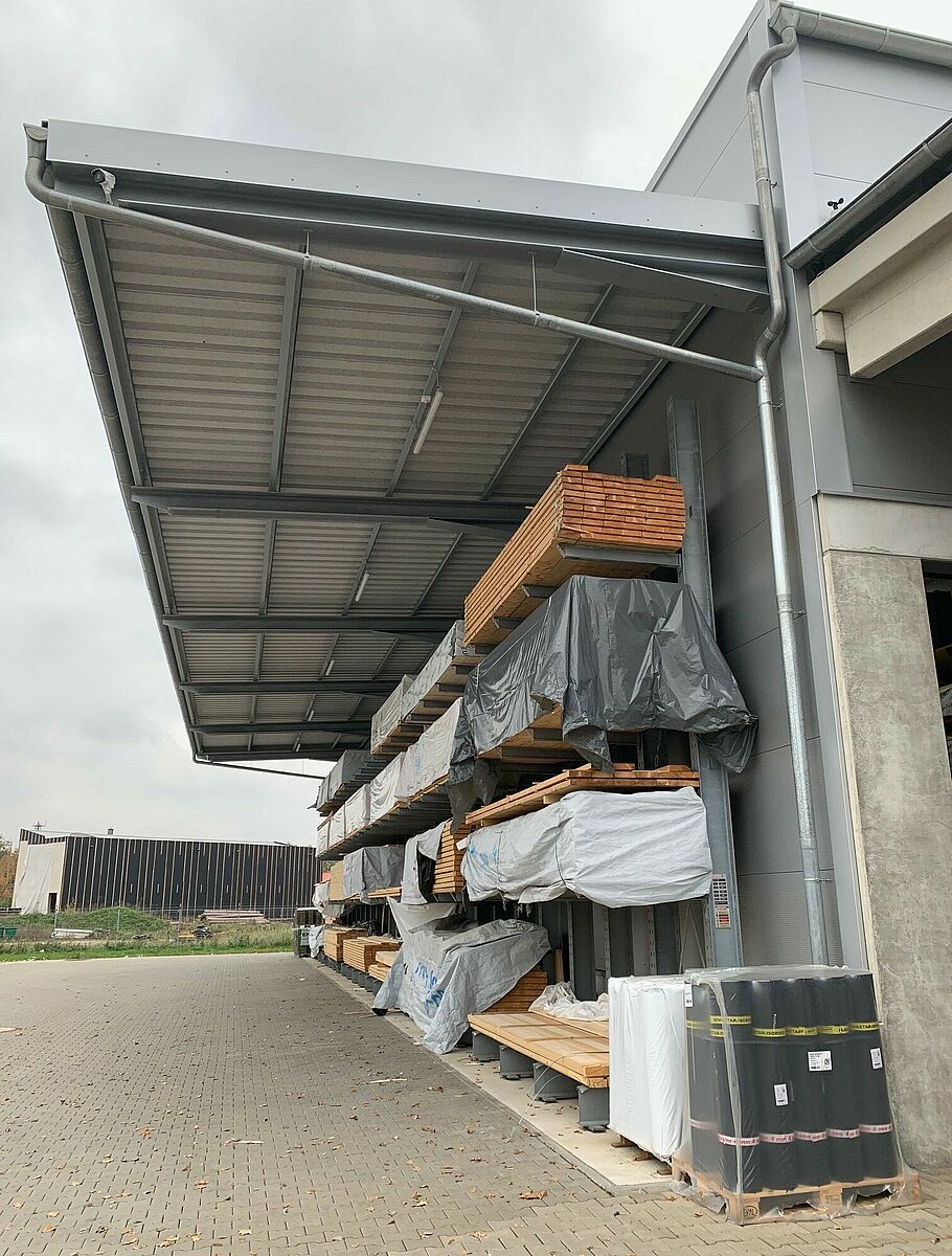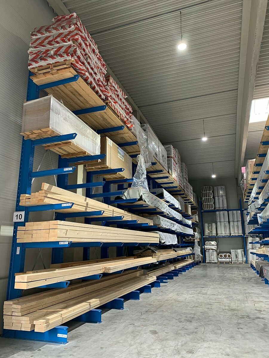 The newly built, 12-metre high warehouse has a surface area of 1,000 square metres and offers additional space for new articles such as façade panels, insulating panels and solid structural timber. Many of the articles now conveniently stored in protected racks used to be left outdoors or on the floor. Not only have the up to 6.58-metre-high pallet racks and the cantilever racks with a height of around 7 metres increased the storage capacity, they have also greatly improved access to the materials, in total OHRA has installed four racking rows around 18 metres long, consisting of pallet and cantilever racks, as well as two 25.5-metre long cantilever racks along the inner walls of the warehouse with six storage levels. Further cantilever racks provide space for less sensitive building materials.
