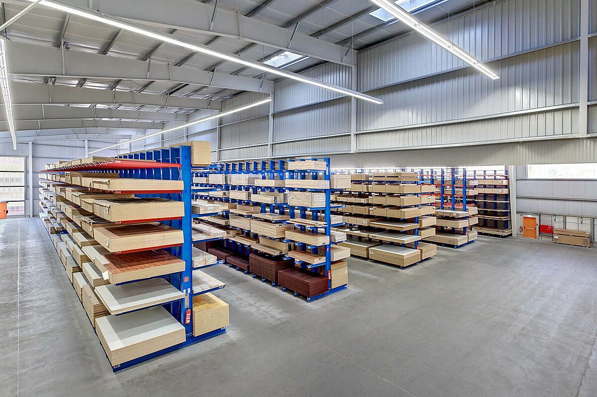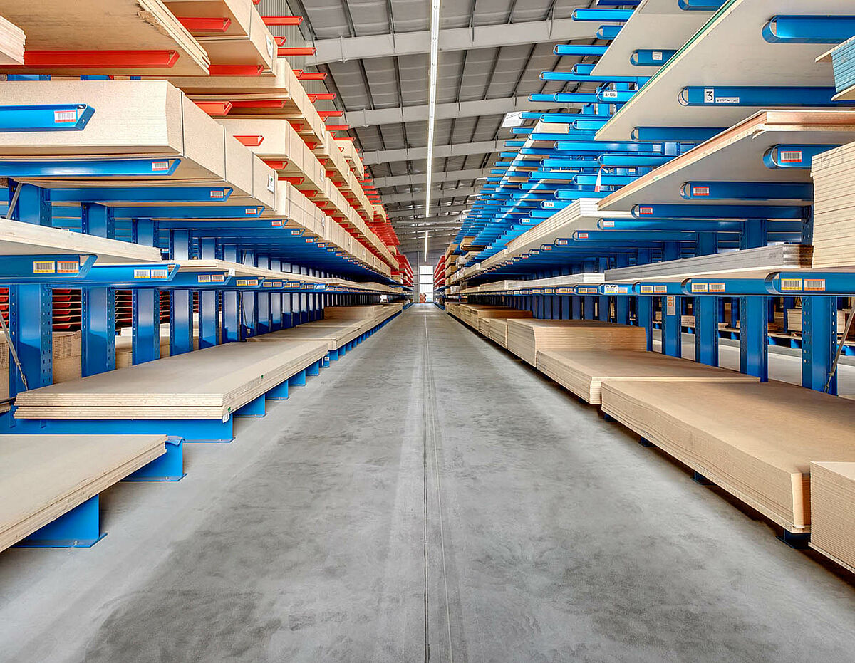 In the "wood panel hall" cantilever length with a radius of up to 2,100 mm is ideal for the storage of wood and particleboard. The storage limit here is 6,500 mm, which is handled by means of a four-way forklift with attachable commissioning platform.