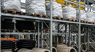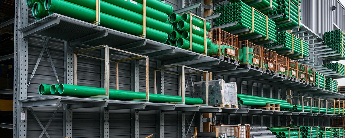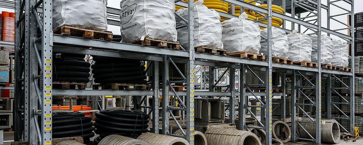 Due to the different materials, OHRA equipped the storage areas with both cantilever and pallet racking. A total of 22 single and double-deep racks with a height of up to 7,500 millimetres were installed. Each rack is individually configured for the different goods in terms of load capacity, number of storage levels and accessories. While the indoor racking is painted in the desired colour, the outdoor racking is galvanised to protect it from the elements. Some of the racking units are fitted with support posts or grids for maximum flexibility when storing items of different sizes. Another special feature is the end rack of the hall: It has been designed to accommodate a sheet piling between the racking uprights, thus forming the rear wall of the building.
