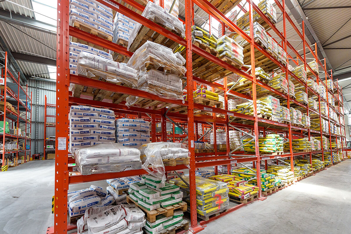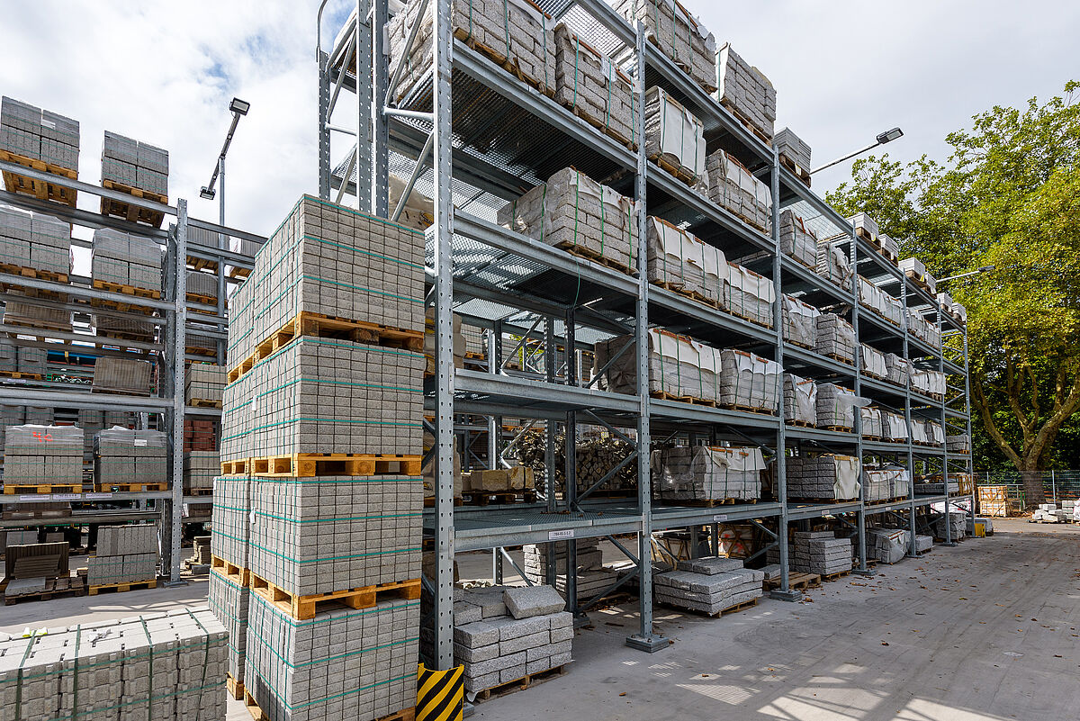 Because Lörrach is in a seismic zone 3, the framework and footplates of the new racking by OHRA have been calculated so that they can carry the additional loads safely. The fact that all the load-bearing parts of the OHRA racks have been manufactured in hot-rolled steel profiles and not sheet metal profiles gives them an inherently high load-bearing capacity. In addition, the uprights will not buckle under lateral strain, even if touched by a forklift truck. Since several of the runs of racking in the outside area are located on a slope, the OHRA experts also designed pallet racks, mounted in stepped layers. Special spacer plates between the racking feet and the mounting plates on the floor, level out additional height differences. The racking in the warehouse, open at one end required a greater calculation effort since an opening of more than 30 percent on one side of the warehouse meant that wind forces had to be included in the calculation.