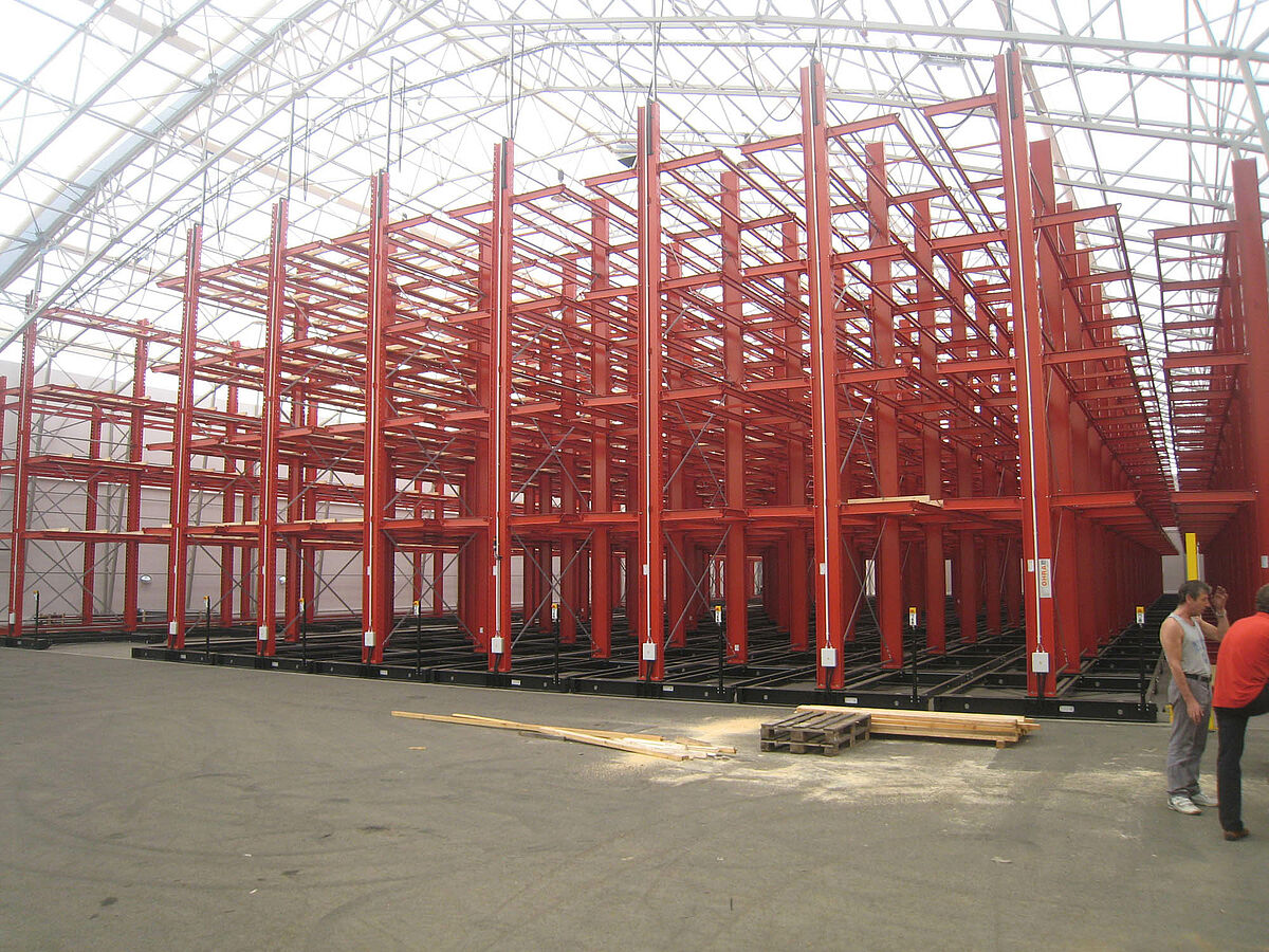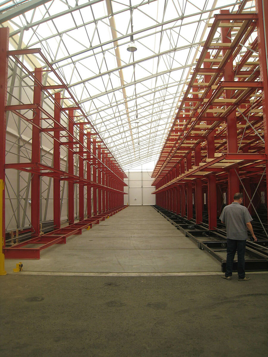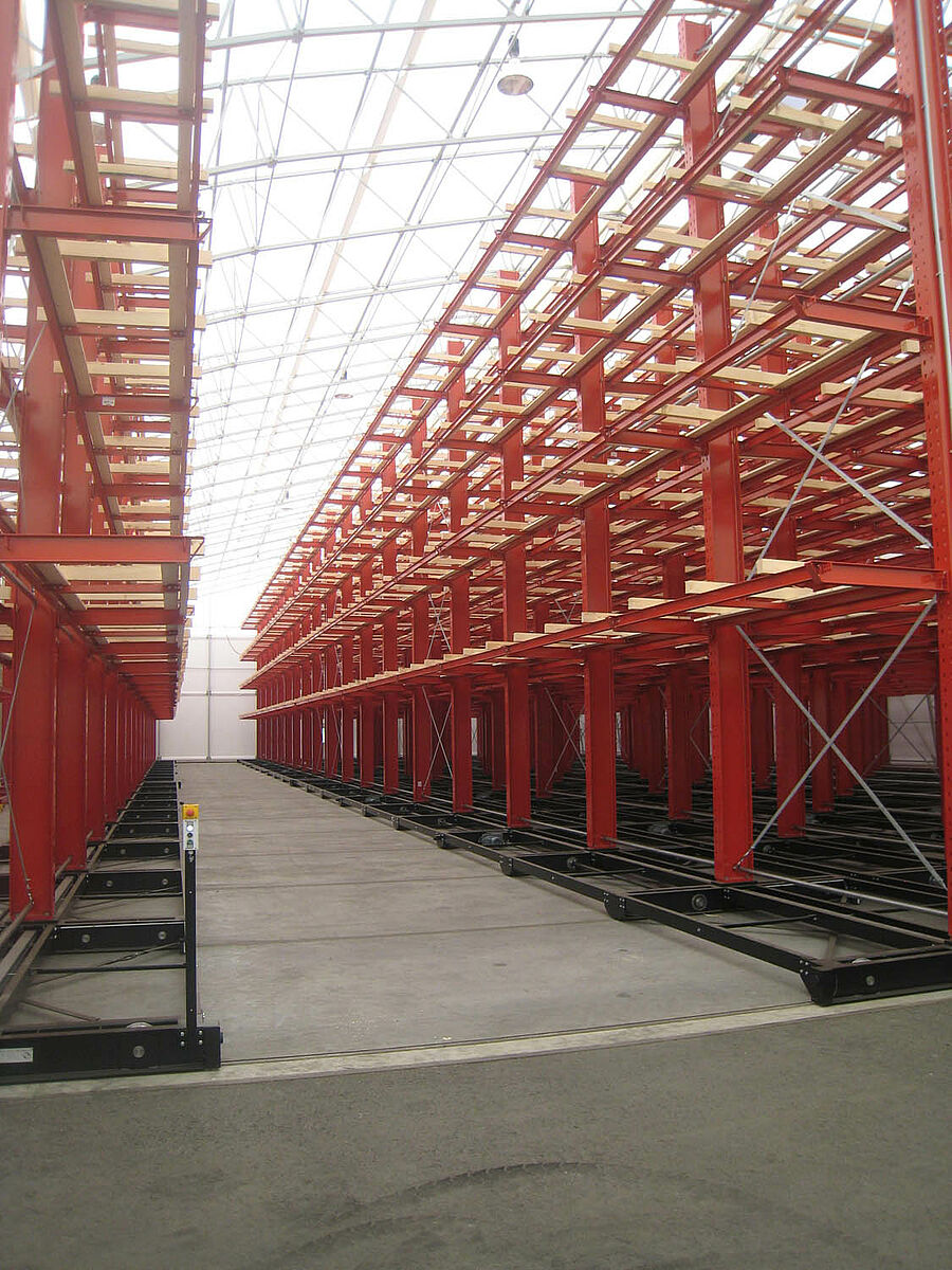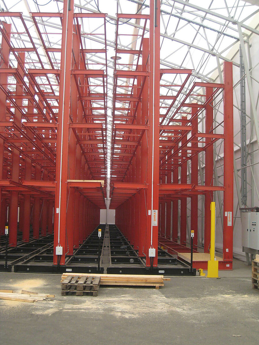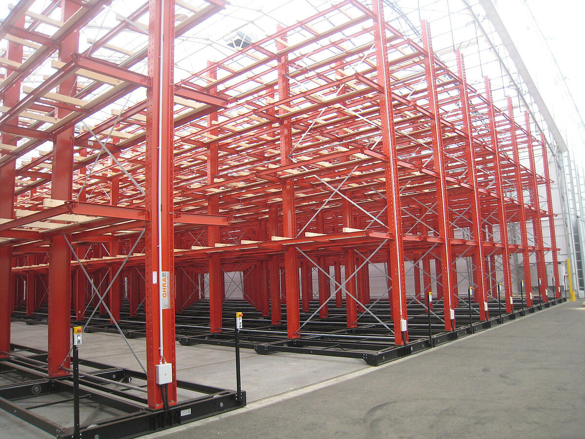 OHRA was responsible for the assembly of the entire rack system. This included the installation of the tracks required for the carriages which took place outdoors before the construction of the actual hall. Of the total of ten 60 meter long cantilever racks with four to five levels and a total height of up to 9.2 meters, two were permanently screwed to the floor. The remaining eight were mounted on 58 meter long carriages from OHRA. The carriages are electrically powered and can be driven apart with a remote control operated from the forklift. Only the desired aisle opens – enabling the storage capacity of an existing area to be almost doubled.