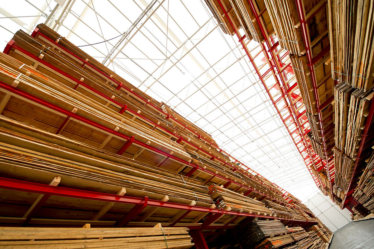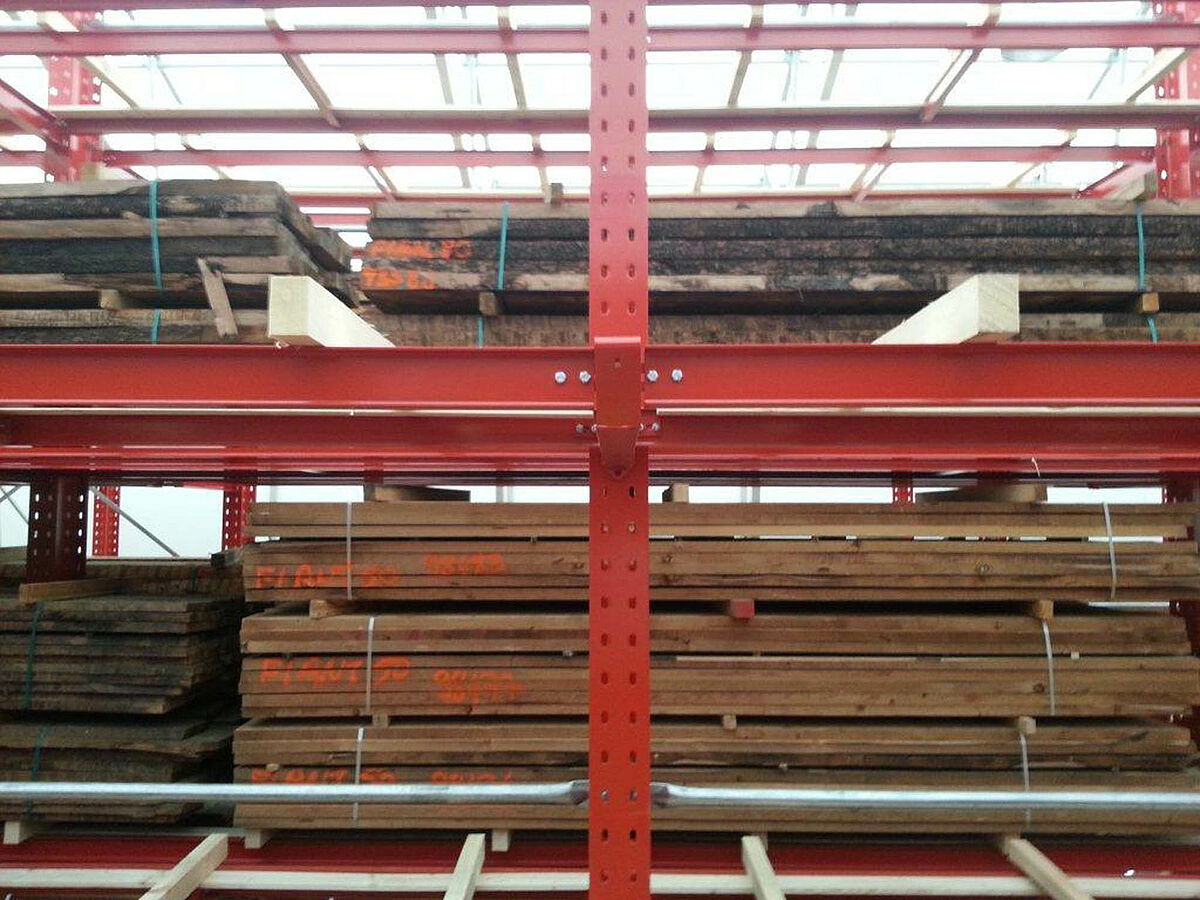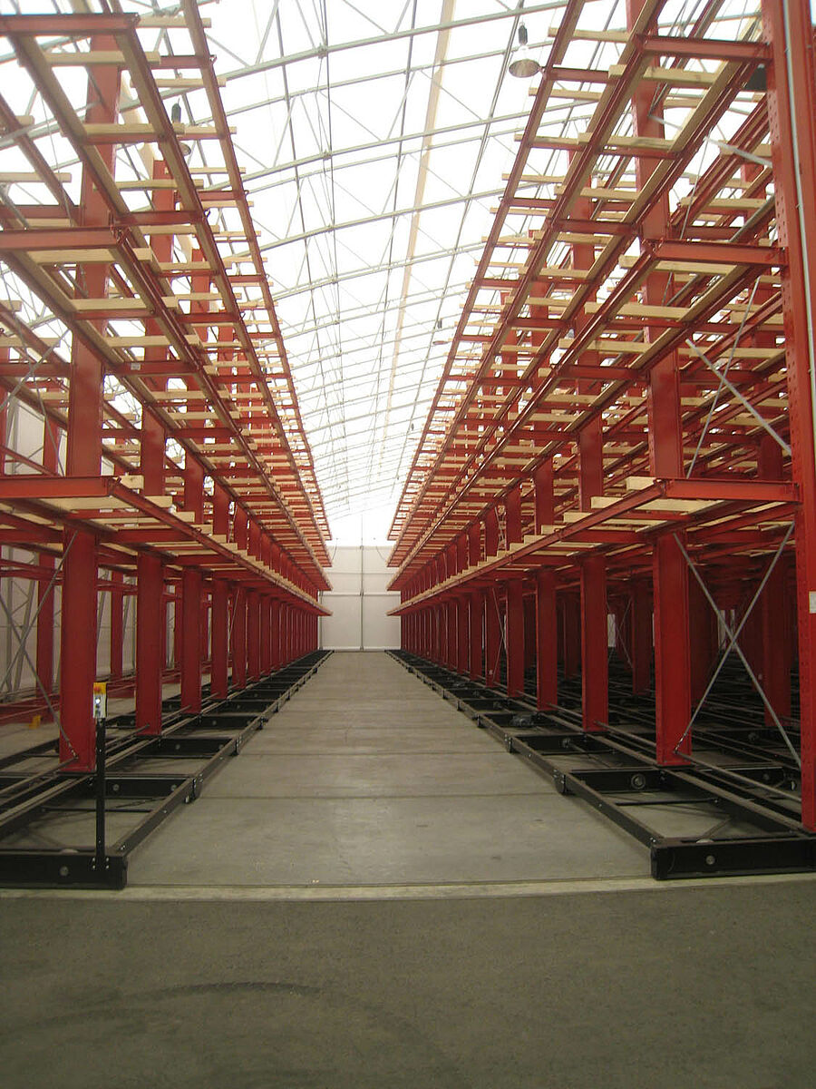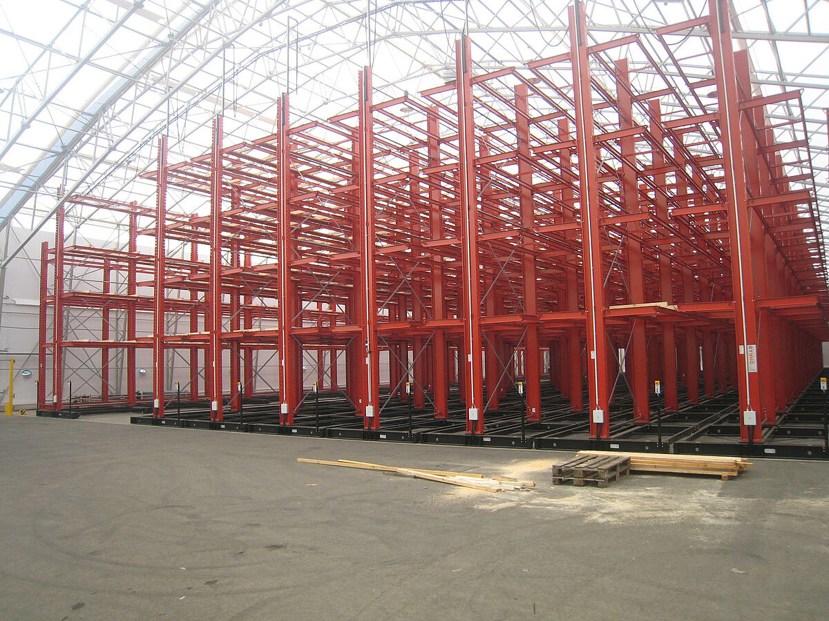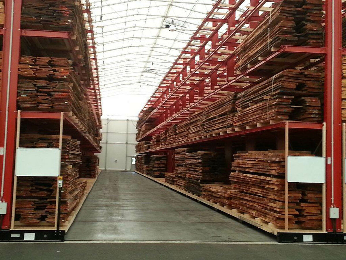 OHRA was responsible for the assembly of the entire rack system. This included the installation of the tracks required for the carriages which took place outdoors before the construction of the actual hall. Of the total of ten 60 meter long cantilever racks with four to five levels and a total height of up to 9.2 meters, two were permanently screwed to the floor. The remaining eight were mounted on 58 meter long carriages from OHRA. The carriages are electrically powered and can be driven apart with a remote control operated from the forklift. Only the desired aisle opens – enabling the storage capacity of an existing area to be almost doubled.