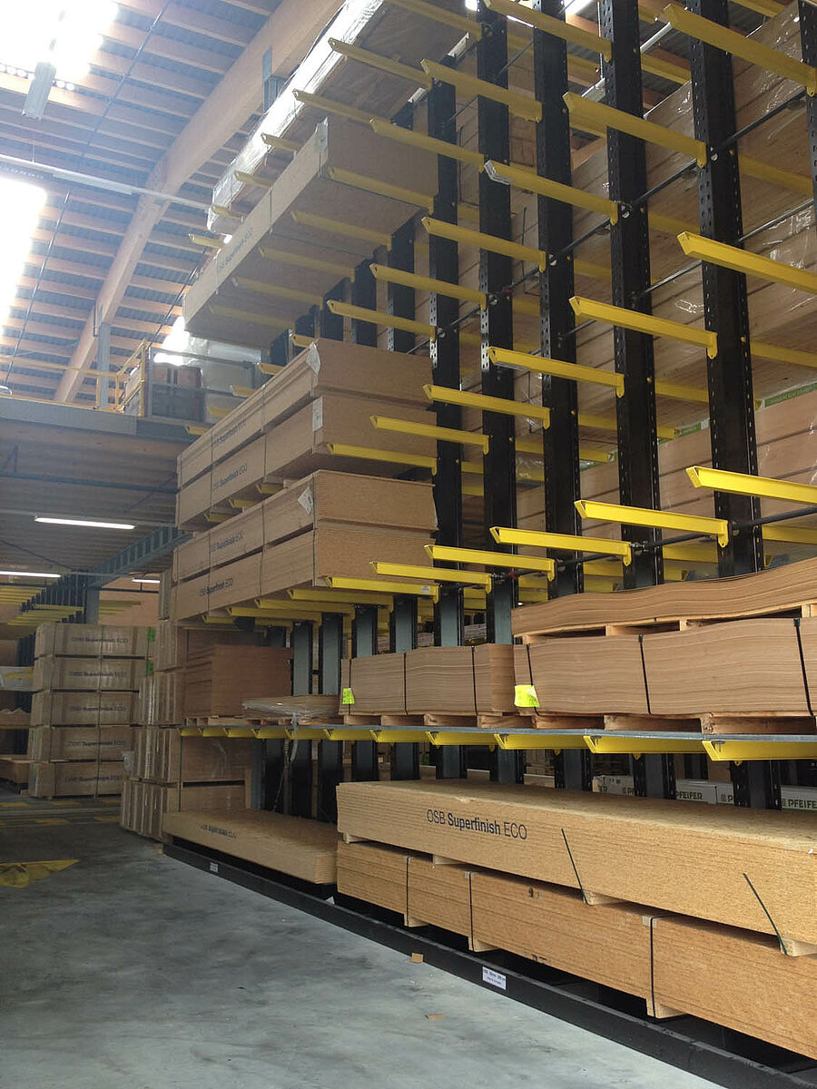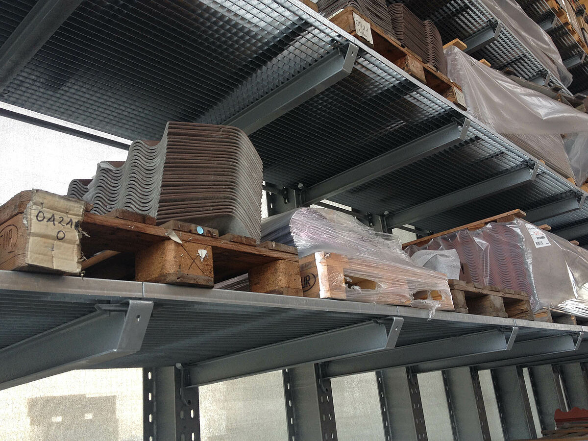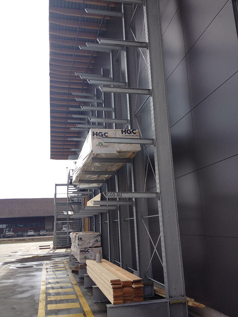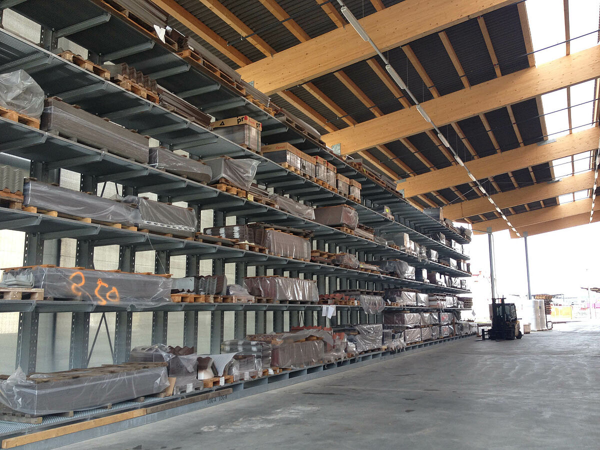 The warehouse in Biel is divided into two drive-through zones covering an area of around 3,000 square meters. In the warehouse OHRA assembled around 600 meters of cantilever racks to a height of 9 meters, composed of seven storage levels employing cantilever arms, generally with a depth of 2.5 meters, serviced by 4-way forklifts. In addition, vertical racks at the ends of the rows of racks facilitate the systematic storage of battens, profiles, and tubing. Hot-dip galvanised pallet and cantilever racks in the outside area provide space for a further 600 pallets. A 1,000 square meter platform has been integrated into the warehouse construction for the storage of insulation material.