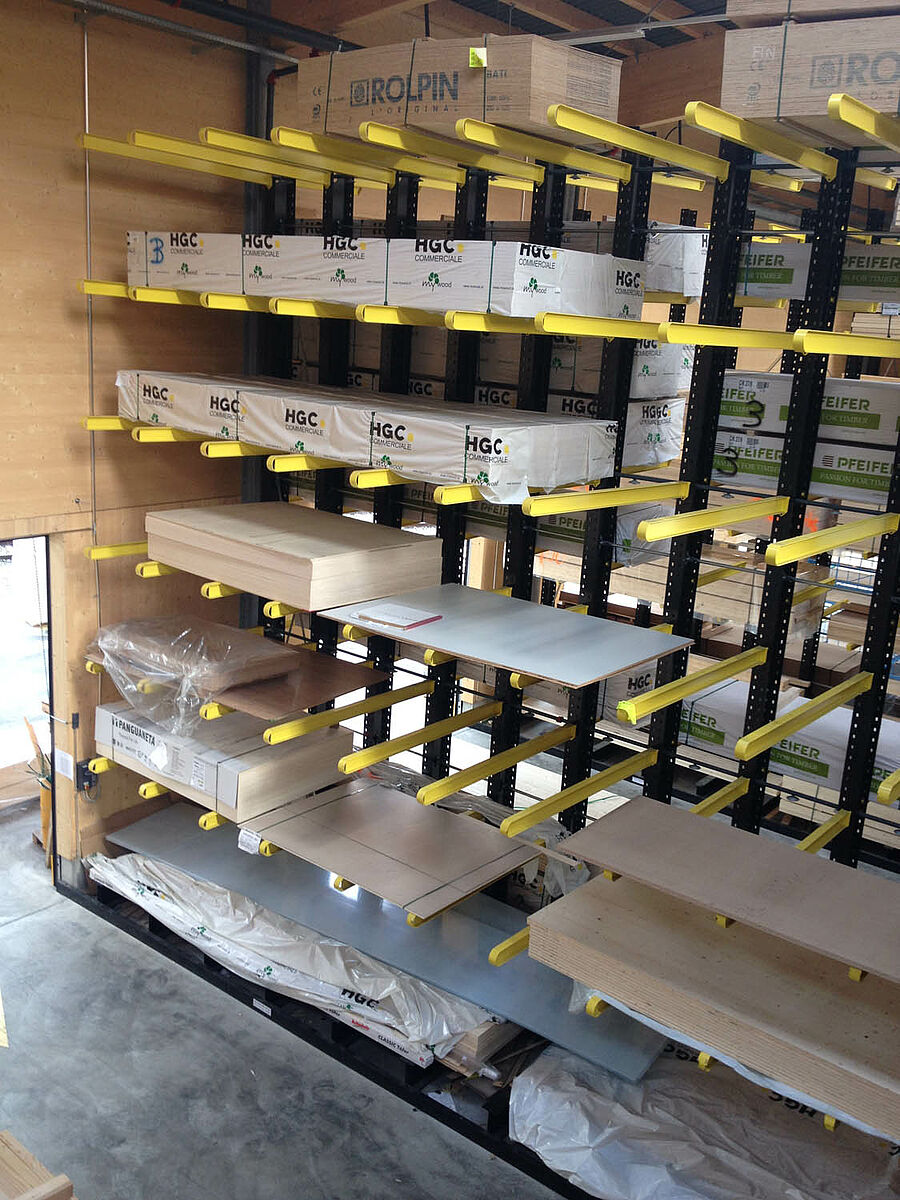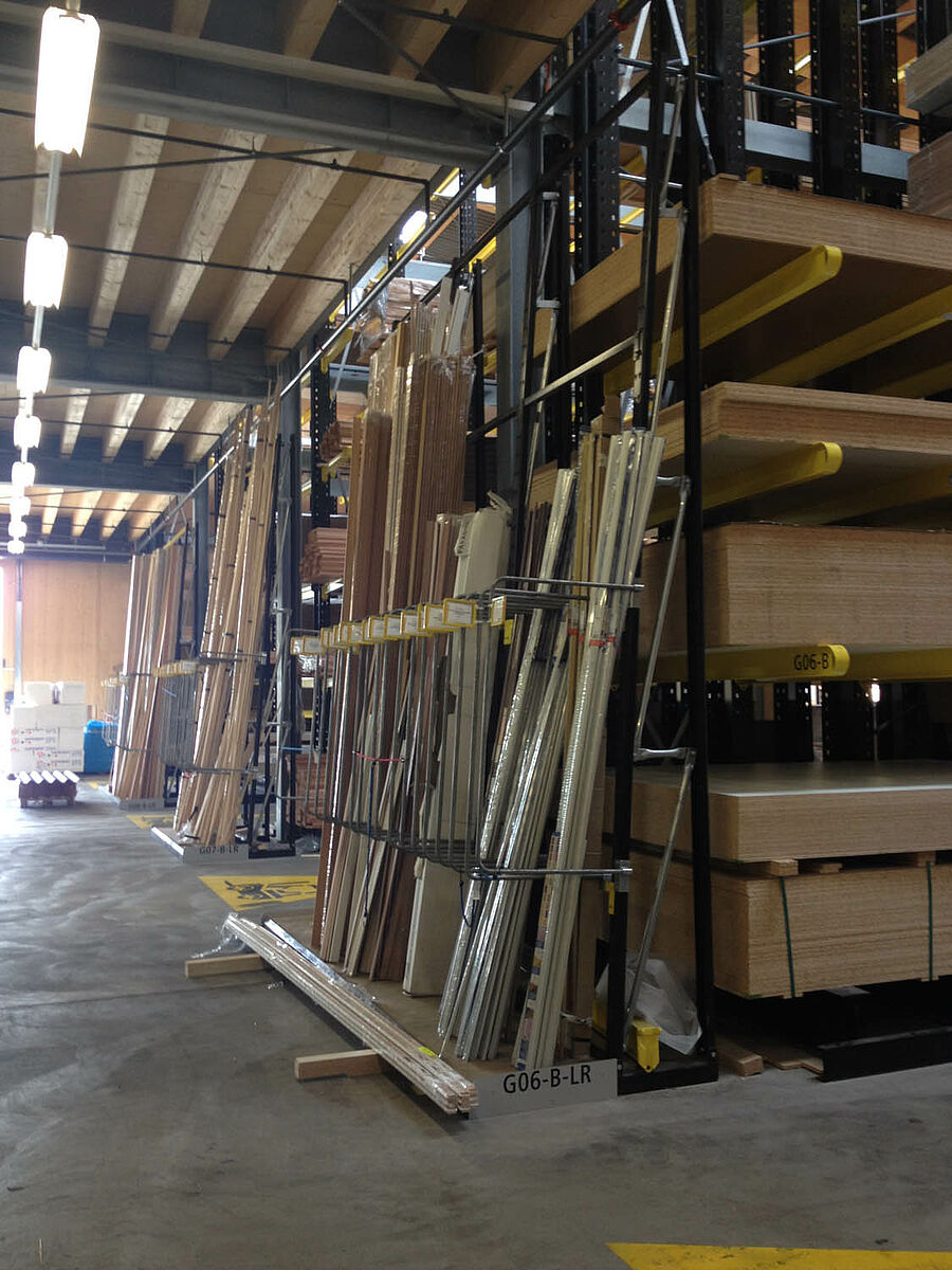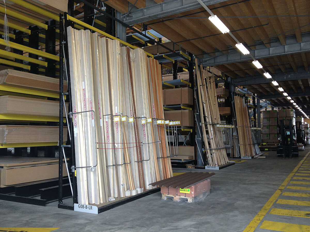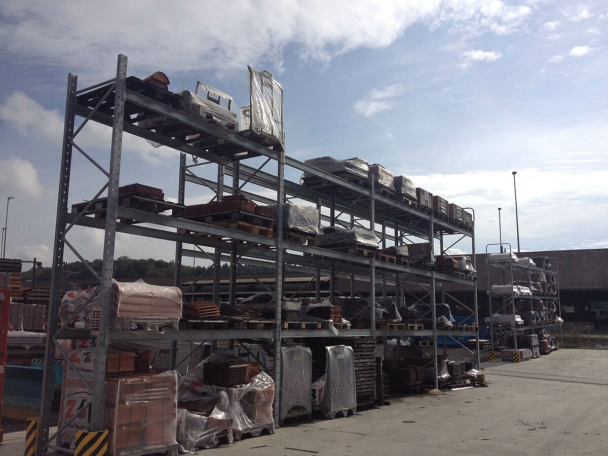 The warehouse in Biel is divided into two drive-through zones covering an area of around 3,000 square meters. In the warehouse OHRA assembled around 600 meters of cantilever racks to a height of 9 meters, composed of seven storage levels employing cantilever arms, generally with a depth of 2.5 meters, serviced by 4-way forklifts. In addition, vertical racks at the ends of the rows of racks facilitate the systematic storage of battens, profiles, and tubing. Hot-dip galvanised pallet and cantilever racks in the outside area provide space for a further 600 pallets. A 1,000 square meter platform has been integrated into the warehouse construction for the storage of insulation material.