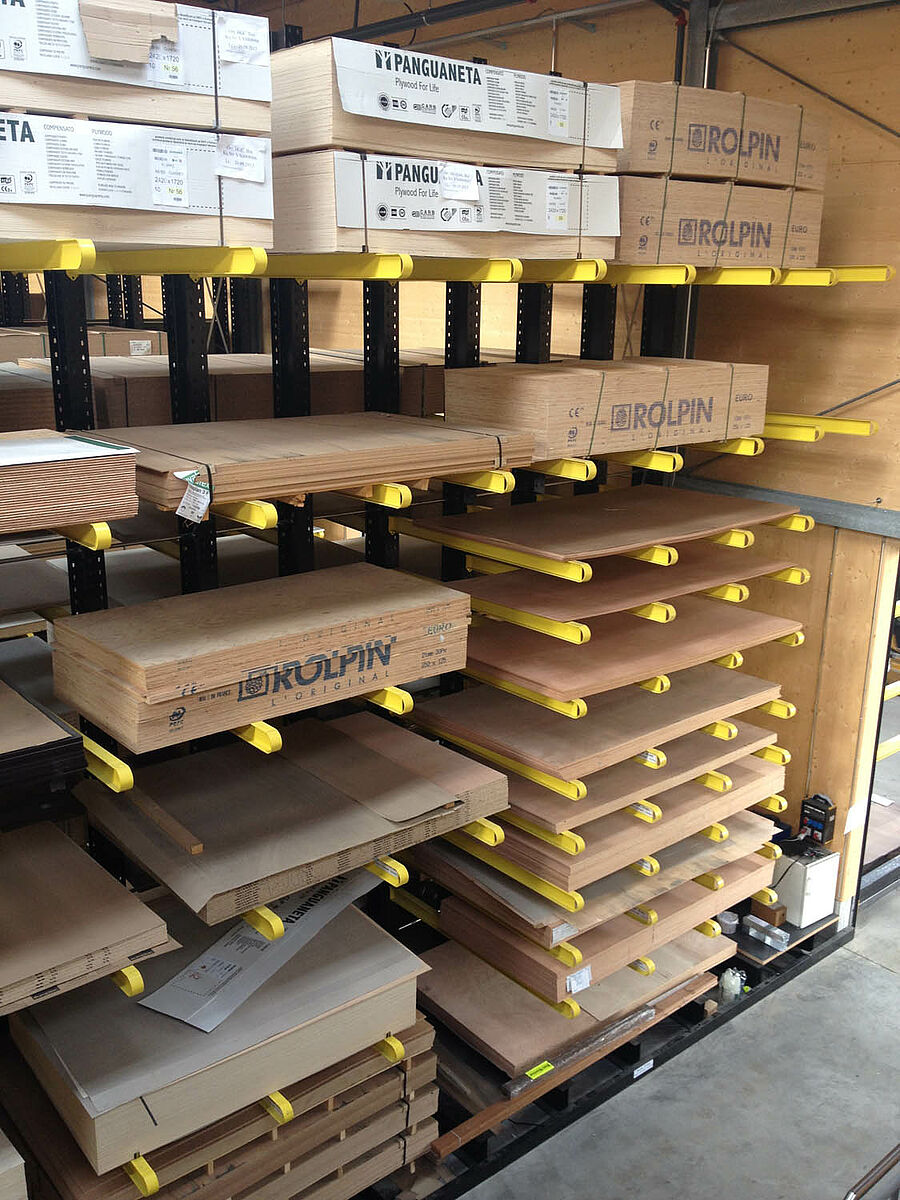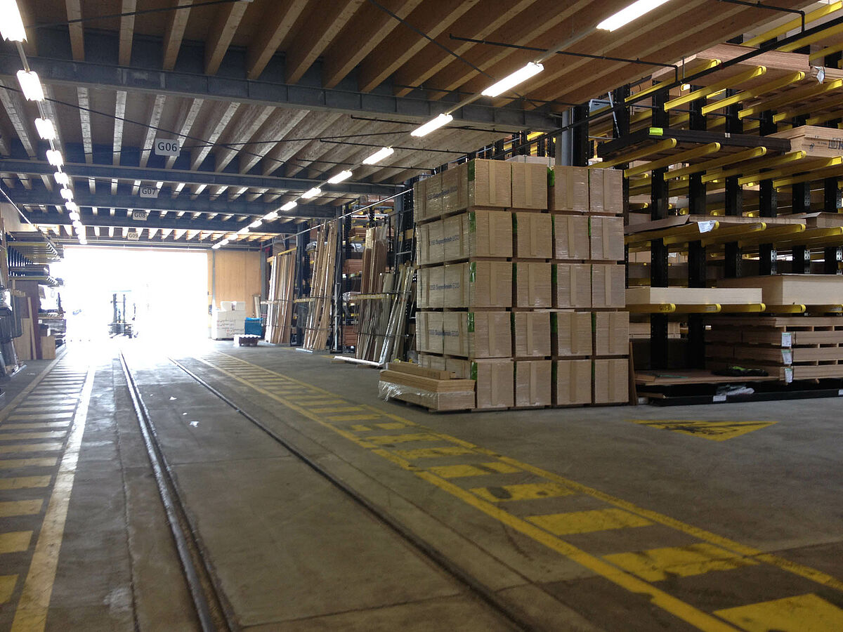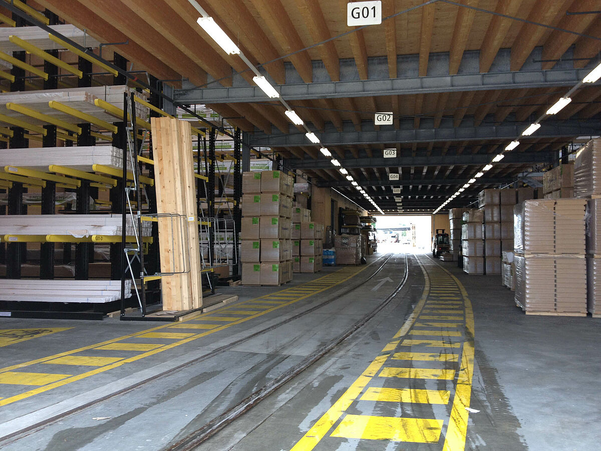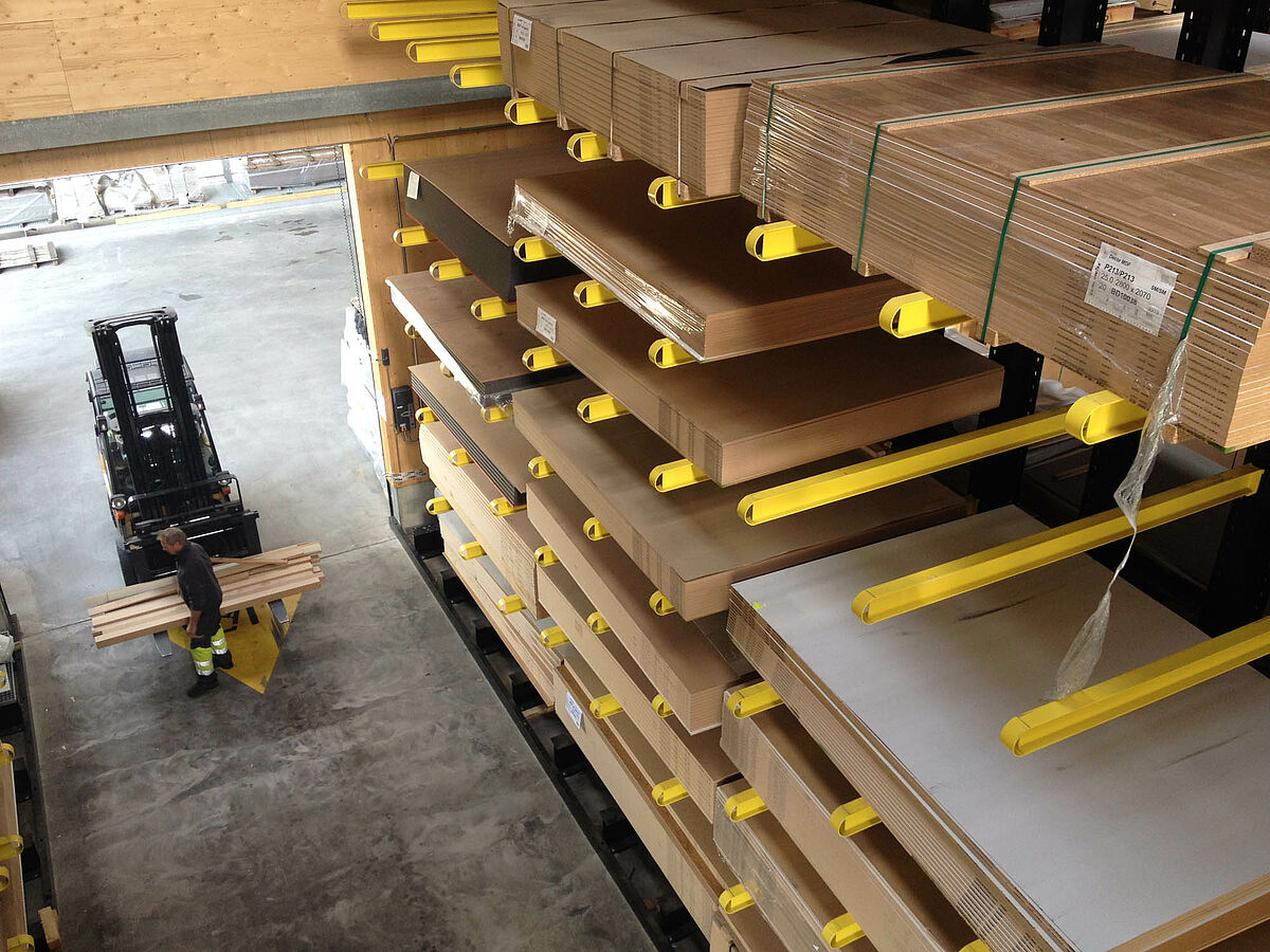 The warehouse in Biel is divided into two drive-through zones covering an area of around 3,000 square meters. In the warehouse OHRA assembled around 600 meters of cantilever racks to a height of 9 meters, composed of seven storage levels employing cantilever arms, generally with a depth of 2.5 meters, serviced by 4-way forklifts. In addition, vertical racks at the ends of the rows of racks facilitate the systematic storage of battens, profiles, and tubing. Hot-dip galvanised pallet and cantilever racks in the outside area provide space for a further 600 pallets. A 1,000 square meter platform has been integrated into the warehouse construction for the storage of insulation material.