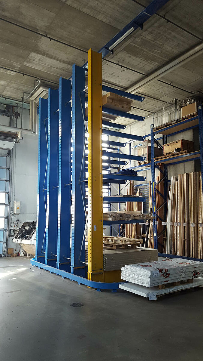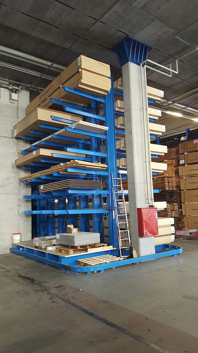 Gfeller invested a total of around EUR 100,000 in the expansion of the storage facility. Today, seven rows of single and double-sided racking of different lengths provides significantly more storage space and more efficient storage workflows. With different arm lengths of 1,850, 2,000 and 2,500 millimetres and load bearing capacities of 1,000 kilograms (i.e. 850 kilograms with the 2.5 meter arms), the racking could be tailored to the local conditions and different stored goods.