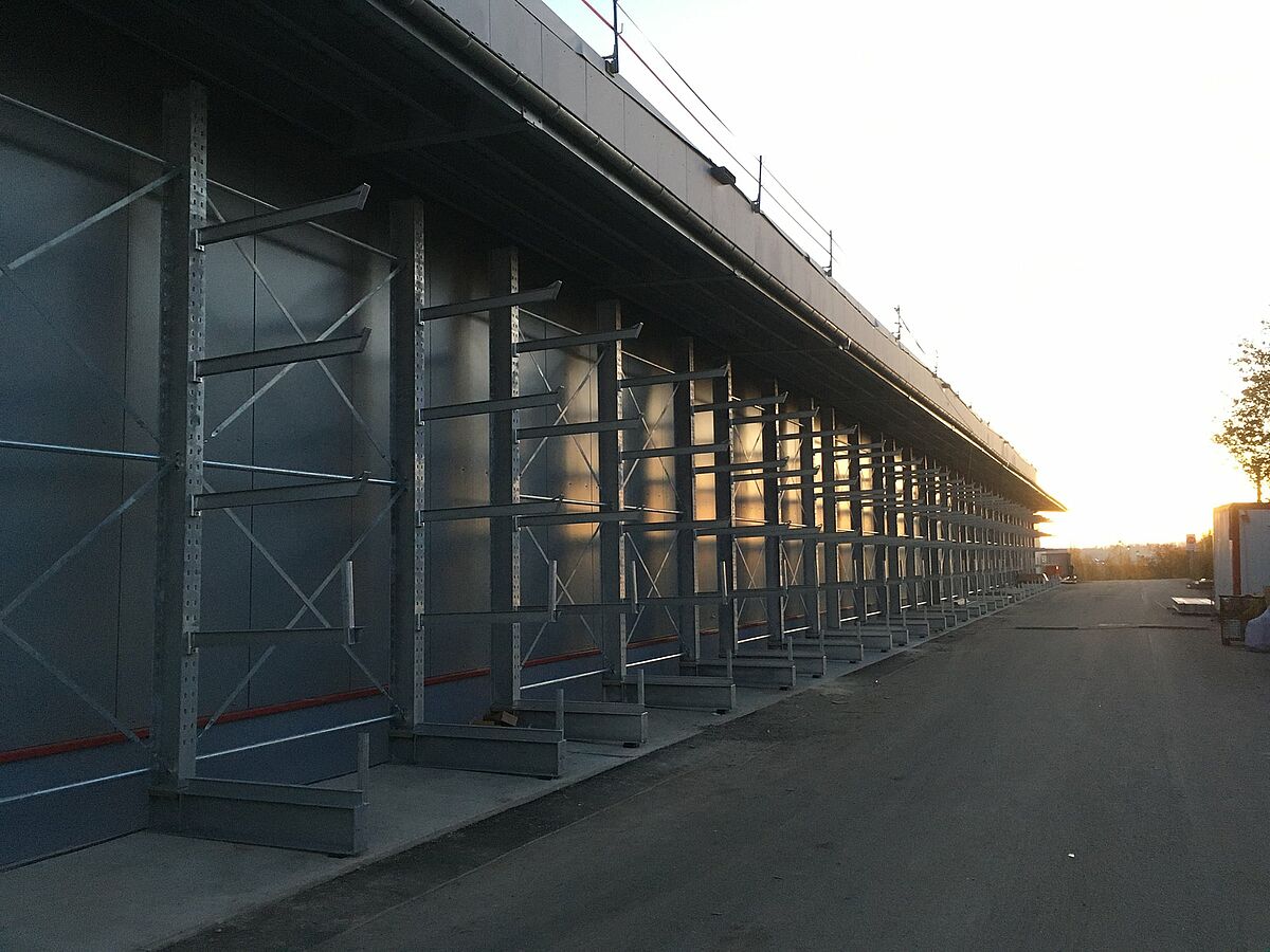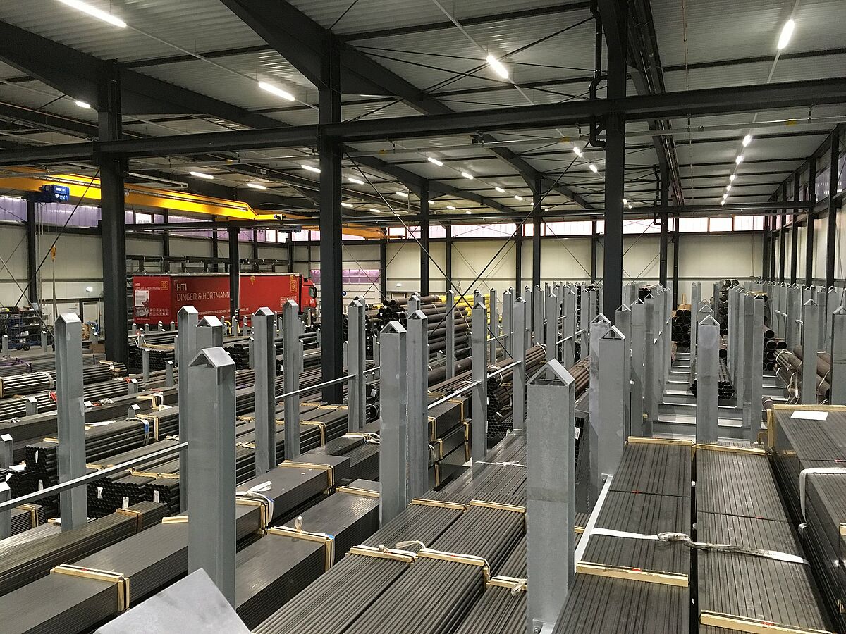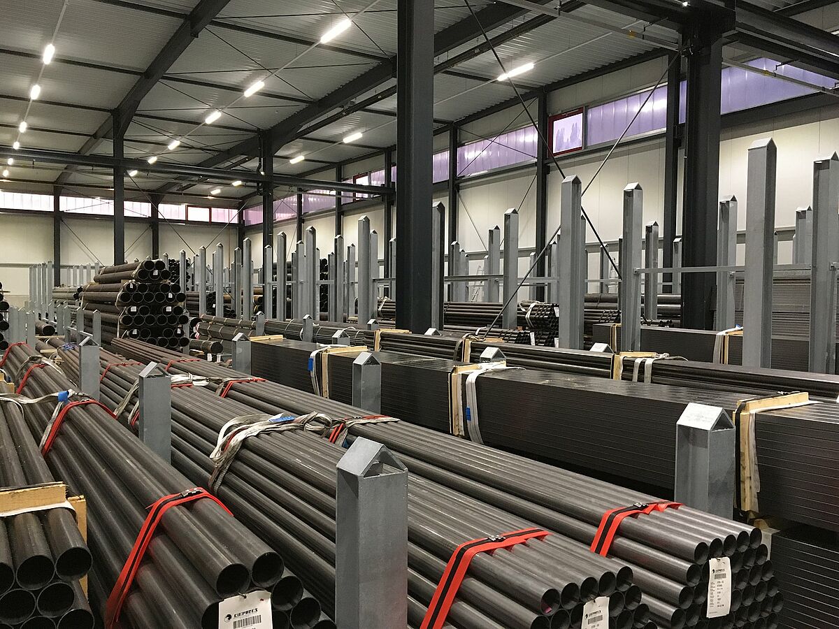 The heavy long pipes and pipe bundles are stored in the post racks, while lighter pipes are housed in OHRA cantilever racks. The approximately 5m high, galvanized racks were installed on the interior walls of the warehouse, and around the entire circumference of the exterior walls. Roll off pins and sleeves at the ends of the 1.4m long, 640 kilogram arms ensure safe storage of the pipes.