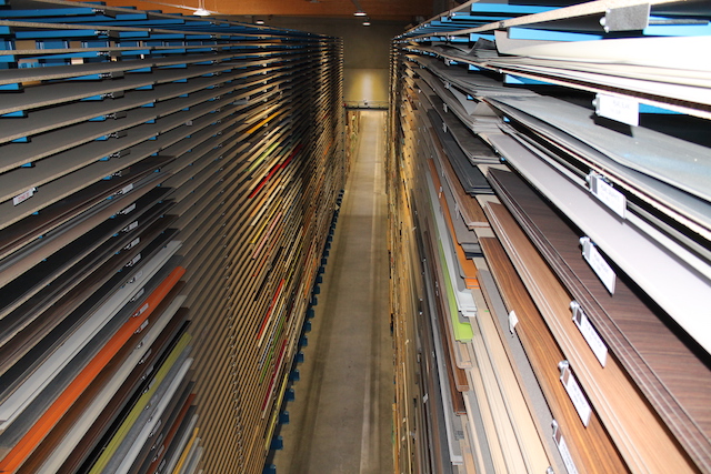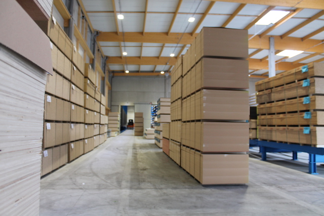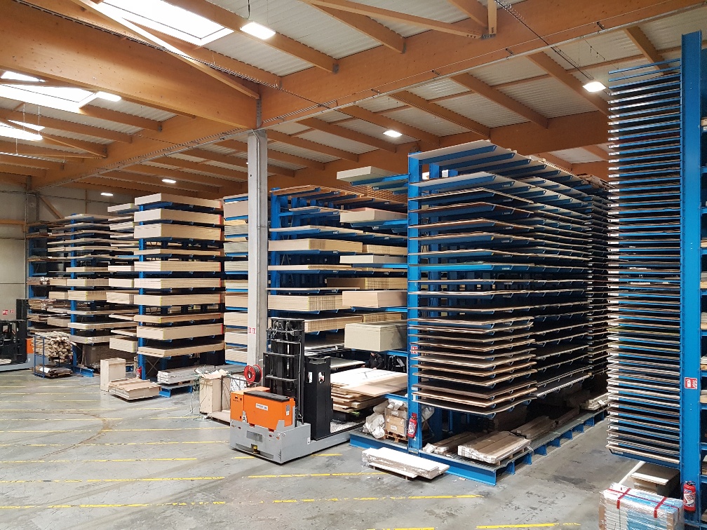 In addition, OHRA installed a mezzanine floor on which racks are placed on top and below, among items stored here are, edge veneer or fittings. This extension of the storage area by a further floor allows optimal use of the available space.
