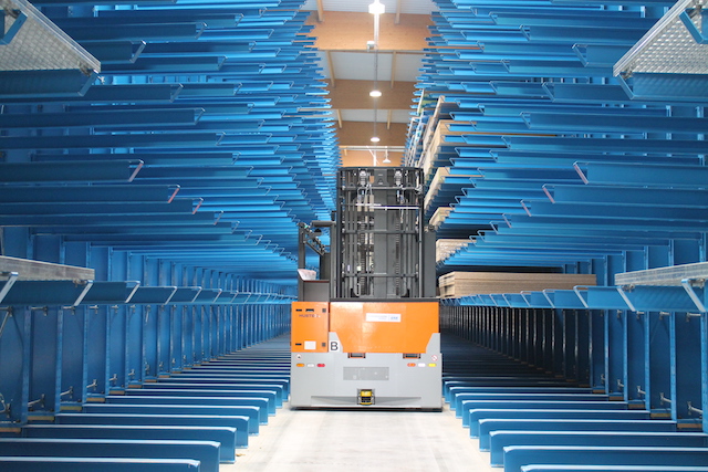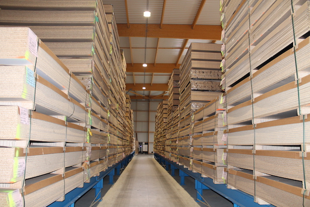 Hue-Socoda, one of the leading distributors of wood panel materials in Brittany, has equipped the new warehouse at its new site in Langueux with a OHRA racking system: Thanks to the heavy-duty cantilever racks, the racking system with a height of nine metres could be achieved – and is more than twice as high as in the old warehouse. In addition, a mezzanine floor optimizes the area utilization in the warehouse: The small materials can be stored using minimal space on two floors. In the goods-in area the 90-centimetre-high bespoke buffer area also simplify the receipt of the supplied sheet material packs by forklifts.