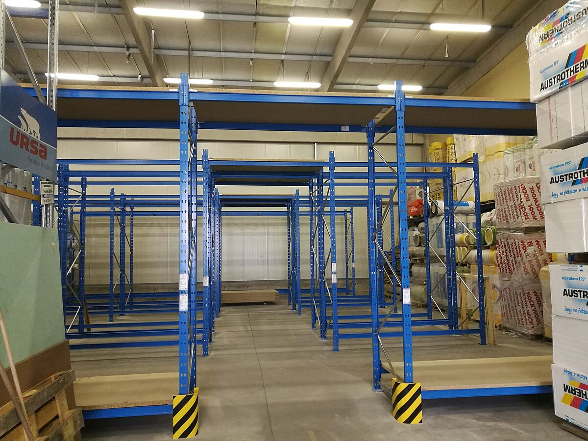 With OHRA's customised pallet racks, it was possible to create a second storage level: Five rows of racks, each measuring 10.6 to 12 metres in length, with a height of 3,580 millimetres—which nearly mirrors the beam height—provide space for insulating materials such as mineral and glass wool. With the help of the racks, the storage volume can now be used almost entirely to the ceiling of the hall. 2.2-metre-wide aisles allow quick access to all racks. Three additional pallet rack rows provide additional space for palletised goods.