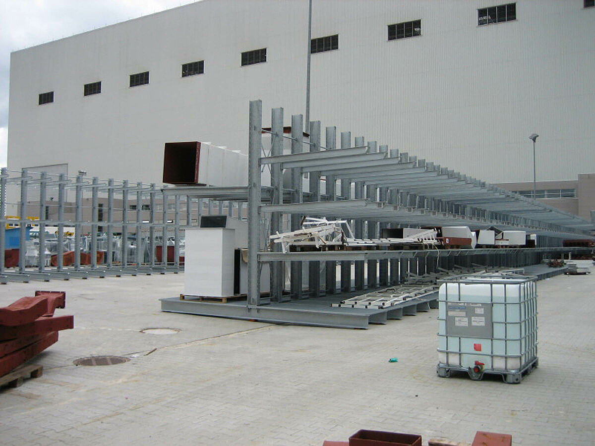 Due to the heavy loads and the poor load capacity of the floor, a special construction has been designed to distribute the loads of the frames onto a larger area. For the exterior use, the racks have been delivered galvanised and assembled by specialised fitters.
