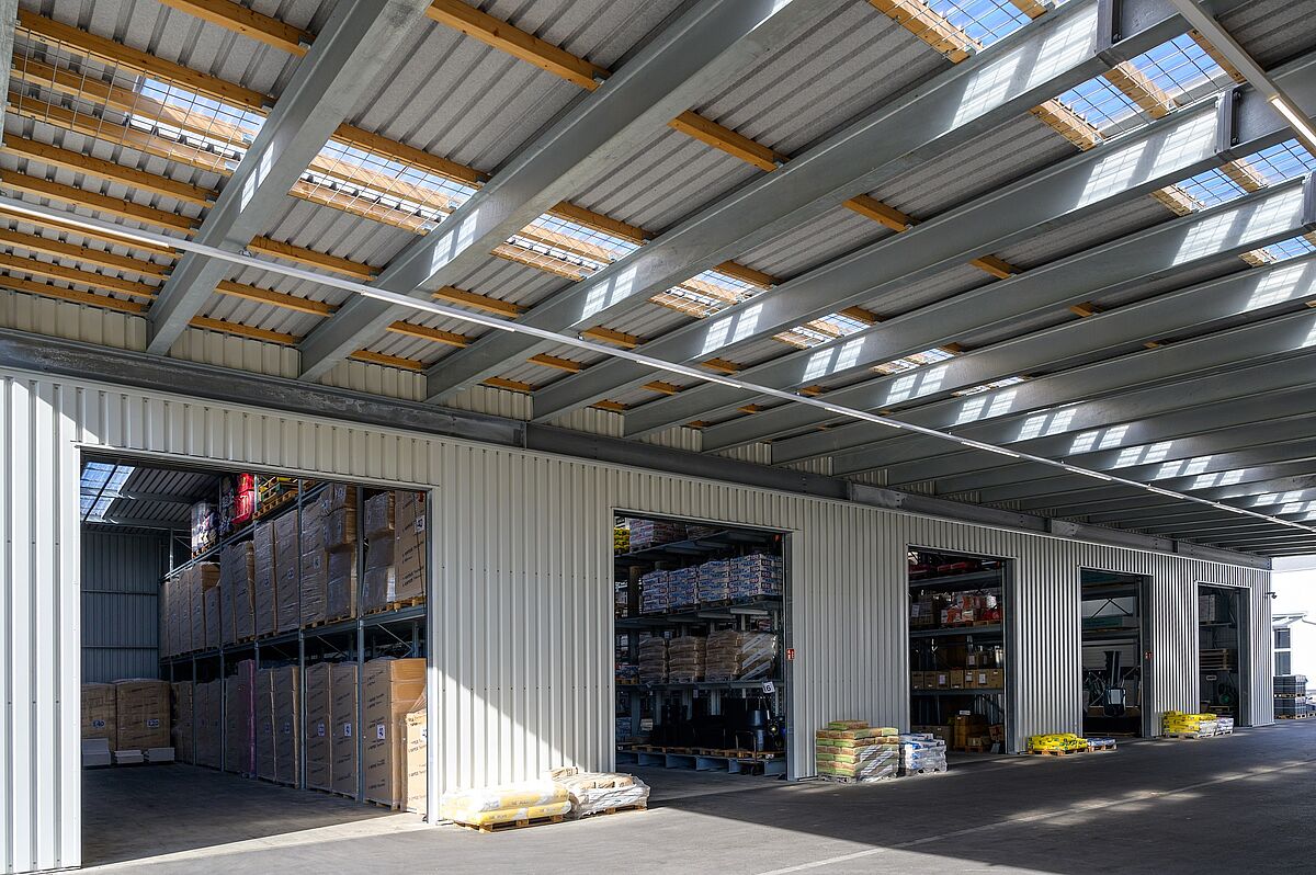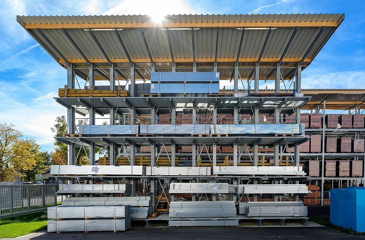 Additional goods can be stored in five 28-metre-long racking rows in the outdoor warehouse; as in the racking hall, cantilever and pallet racking was also installed here. Each row of racks has a roof with an overhang of one metre. Between the racking hall and the outdoor storage area runs the lane where the goods are made available to the customers. The lane is covered by a 13-metre-wide roof that connects the racking hall and the outdoor storage area.