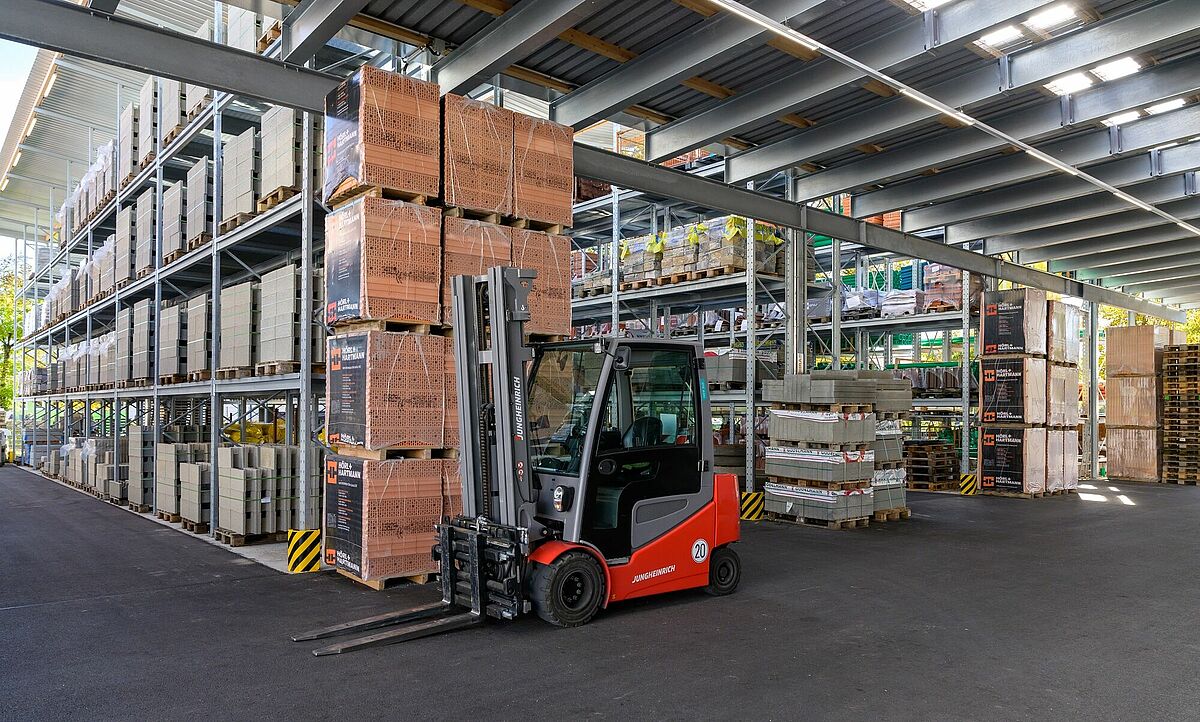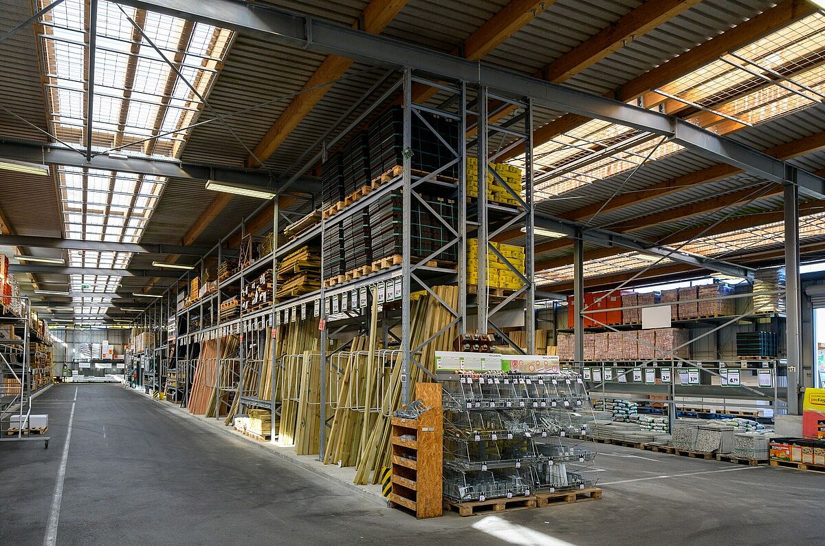 In order to be able to flexibly store the variety of items carried by Baucentrum Schneider, OHRA has equipped the racks with gratings - so that everything from cement bags to Euro pallets can be stored in any place in the rack.