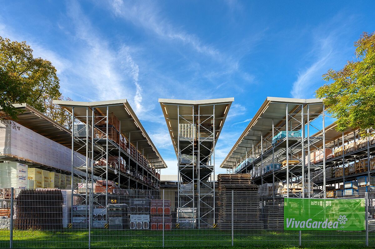 Conveniently drive with the vehicle directly to the desired goods and load them - especially with bulky and heavy items such as (garden) building materials or garden timber, the drive-in concept makes shopping in the DIY store easier. Schneider also relies on this approach in the specialised trade. Customers can conveniently get their required goods under the three-lane covered loading area, regardless of the weather. The hall was designed by OHRA as a rack clad unit: Here, the cantilever column supports serve as a load-bearing substructure for the building construction. This shortens the project time and offers considerable cost advantages. The racking unit is complemented by cantilever and pallet racking in the outdoor area, where the goods are protected from the weather by an integrated roof. Both areas are connected by a 13-metre spanning roof. In addition, OHRA realised a frost-free warm area, in which construction chemicals as well as floor coverings are safely stored next to an office area.
