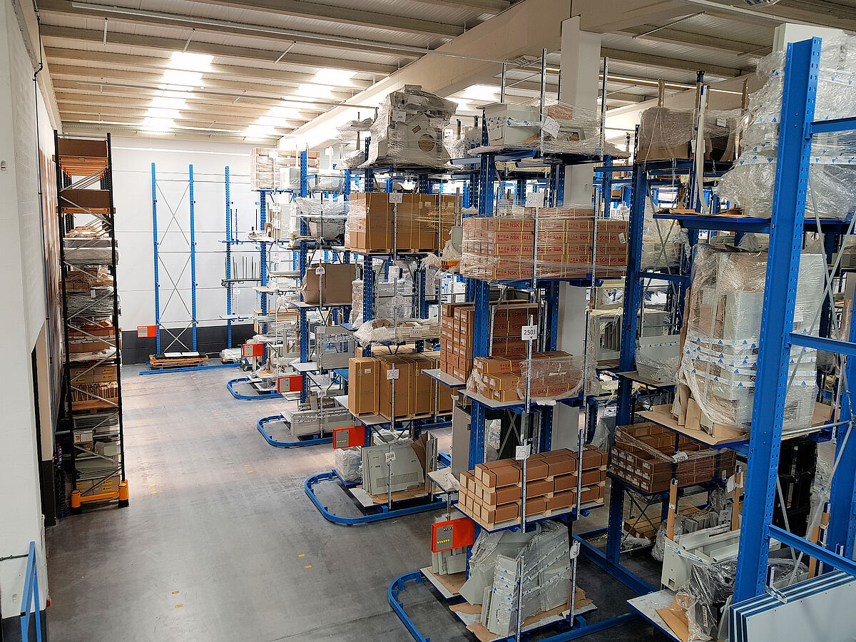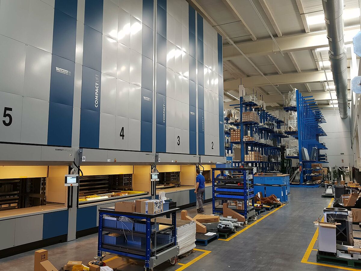 The Spanish company Seuner Fabricados installed a new OHRA racking system for the storage of lathe components. The central task was to create high storage capacities for differently dimensioned components, which are stored on company-specific load carriers. This was solved by 8.58-metre-high cantilever racks, which offer both continuous storage levels and space for long goods.