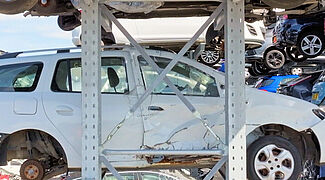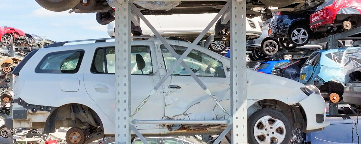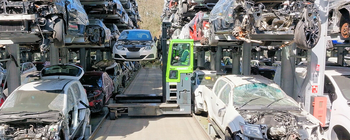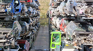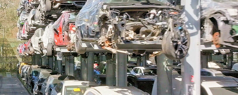 Silverlake Automotive Recycling, Hampshire, stores cars, SUVs and vans in cantilever racks from OHRA in order to have as many end-of-life vehicles as possible in direct access at all times. Thanks to the shelves, which are over 8 metres high, five vehicles weighing up to 2 tonnes each can be safely "stacked" on top of each other. The rack rows are also equipped with guide rails so that the old vehicles can be stored and retrieved using a side loader. This means that the aisles between the shelves can be kept particularly narrow and more shelves can be placed in the space. Silverlake can therefore store around 2,500 end-of-life vehicles on the site.