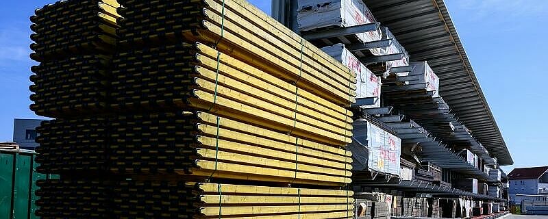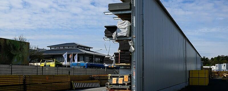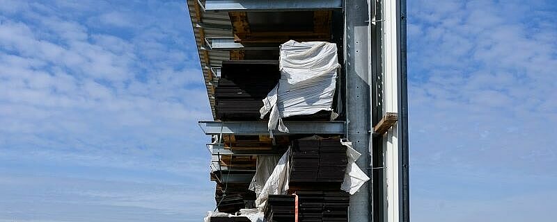 An integrated, two-meter-deep roof and a trapezoidal sheet metal back wall protect the stored plywood panels from the elements. One challenge was that the panels ranged in size from 3.3 x 2.4 meters to 0.6 x 0.3 meters. To prevent the panels from bending during storage, OHRA adjusted the distance between the uprights and varied it within the rack: The distance between 26 uprights is 1,000 millimeters, the distance between the remaining 27 uprights is 1,200 millimeters. Thus, all formats can be stored safely and the space can be used well.