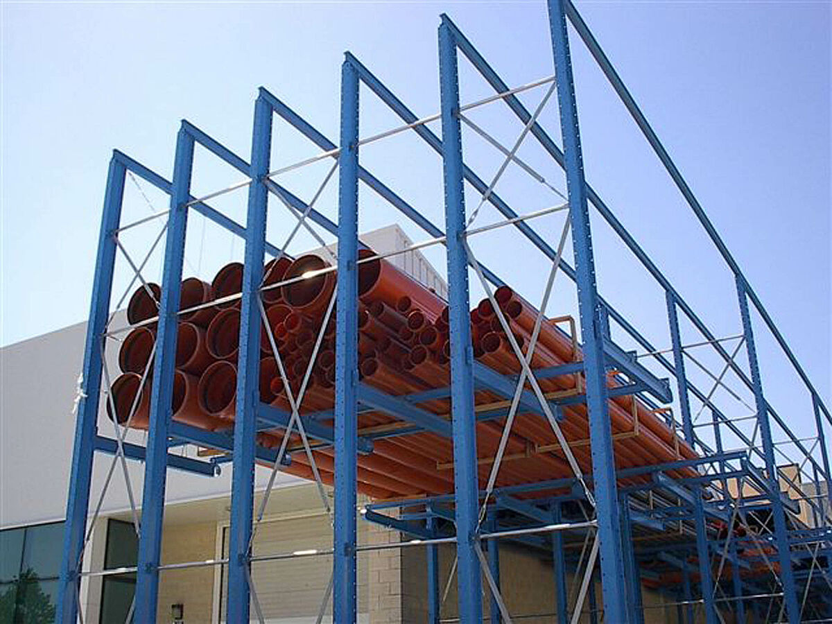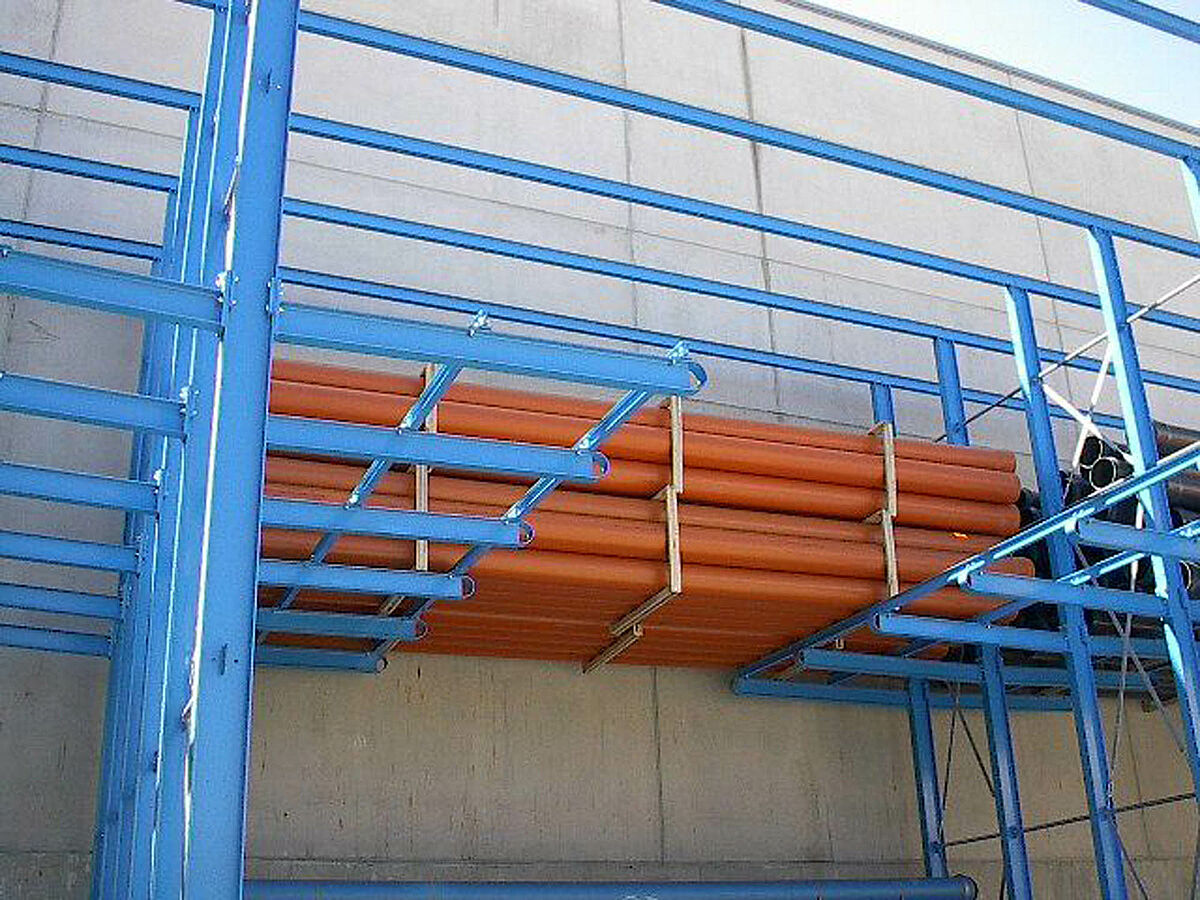 As a complement to the Drive in- OHRA also delivered and assembled robust cantilever. Here, the grades are stored, which are required less frequently. The tube bundles are stored here in several superimposed layers. Thanks to the cantilever length of up to 2,500 mm, the customer can also store 2 consecutive pipe packets on a plain area.