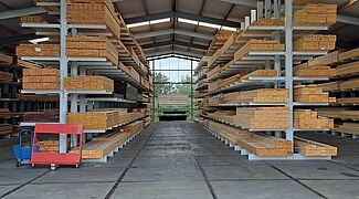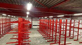 Due to the positive experience van Deuveren had already had with racking from OHRA, the new company headquarters was also equipped with racking systems from the European market leader for cantilever racking. OHRA manufactures the rack uprights and cantilever arms from solid-walled, hot-rolled IPE steel profiles, which means that the cantilever racks remain permanently stable even when fully utilised and ensure a high level of safety for staff and customers. OHRA always manufactures the racks individually according to the customer's requirements - at van Deuveren this applied not only in terms of dimensions and load-bearing capacity, but also in terms of colour.